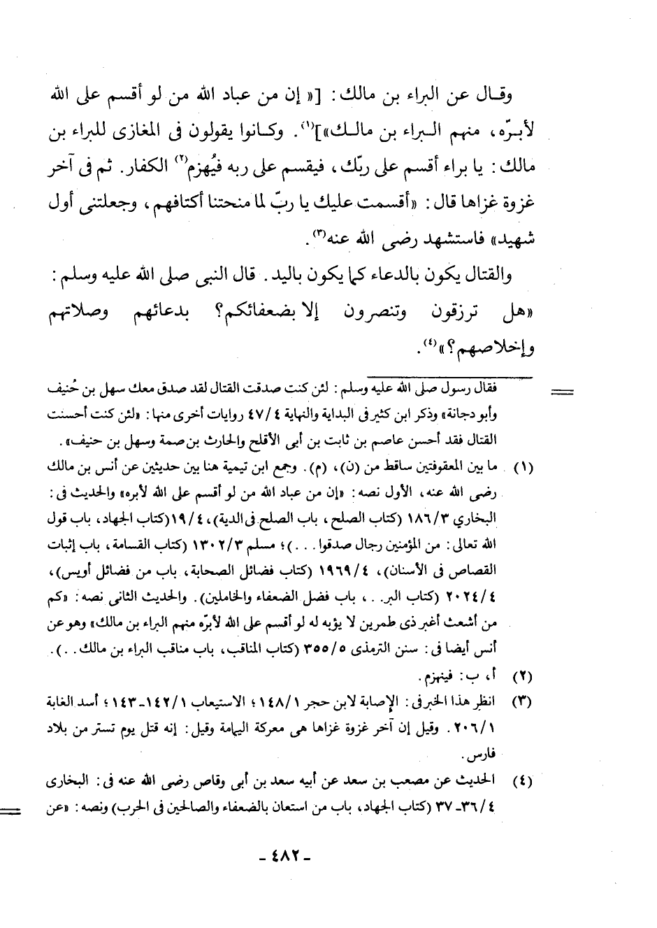 (¬1) مَا بَيْنَ الْمَعْقُوفَتَيْنِ سَاقِطٌ مِنْ (ن) ، (م) . وَجَمَعَ ابْنُ تَيْمِيَّةَ هُنَا بَيْنَ حَدِيثَيْنِ عَنْ أَنَسِ بْنِ مَالِكٍ - رَضِيَ اللَّهُ عَنْهُ -، الْأَوَّلُ نَصُّهُ: " إِنَّ مِنْ عِبَادِ اللَّهِ مَنْ لَوْ أَقْسَمَ عَلَى اللَّهِ لَأَبَرَّهُ " وَالْحَدِيثُ فِي: الْبُخَارِيِّ 3/186 (كِتَابُ الصُّلْحِ، بَابُ الصُّلْحِ فِي الدِّيَةِ) 4/19 (كِتَابُ الْجِهَادِ، بَابُ قَوْلِ اللَّهِ تَعَالَى: مِنَ الْمُؤْمِنِينَ رِجَالٌ صَدَقُوا. . .) ; مُسْلِمٌ 3/1302 (كِتَابُ الْقَسَامَةِ. بَابُ إِثْبَاتِ الْقِصَاصِ فِي الْأَسْنَانِ) ، 4/1969 (كِتَابُ فَضَائِلِ الصَّحَابَةِ، بَابُ مِنْ فَضَائِلِ أُوَيْسٍ) ، 4/2024 (كِتَابُ الْبِرِّ. .، بَابُ فَضْلِ الضُّعَفَاءِ وَالْخَامِلِينَ) . وَالْحَدِيثُ الثَّانِي نَصُّهُ: " كَمْ مِنْ أَشْعَثَ أَغْبَرَ ذِي طِمْرَيْنِ لَا يَؤْبَهُ لَهُ لَوْ أَقْسَمَ عَلَى اللَّهِ لَأَبَرَّهُ مِنْهُمُ الْبَرَاءُ بْنُ مَالِكٍ " وَهُوَ عَنْ أَنَسٍ أَيْضًا فِي: سُنَنِ التِّرْمِذِيِّ 5/355 (كِتَابُ الْمَنَاقِبِ، بَابُ مَنَاقِبِ الْبَرَاءِ بْنِ مَالِكٍ. .) .