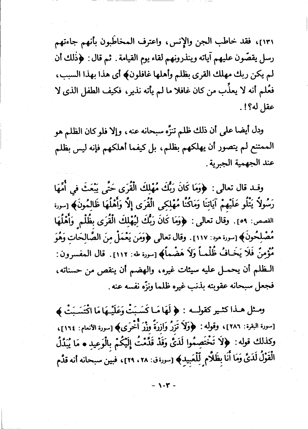 وَقَدْ قَالَ تَعَالَى: {وَمَا كَانَ رَبُّكَ مُهْلِكَ الْقُرَى حَتَّى يَبْعَثَ فِي أُمِّهَا رَسُولًا يَتْلُو عَلَيْهِمْ آيَاتِنَا وَمَا كُنَّا مُهْلِكِي الْقُرَى إِلَّا وَأَهْلُهَا ظَالِمُونَ} [سُورَةُ الْقَصَصِ: 59] . وَقَالَ تَعَالَى: {وَمَا كَانَ رَبُّكَ لِيُهْلِكَ الْقُرَى بِظُلْمٍ وَأَهْلُهَا مُصْلِحُونَ} [سُورَةُ هُودٍ: 117] . وَقَالَ تَعَالَى: {وَمَنْ يَعْمَلْ مِنَ الصَّالِحَاتِ وَهُوَ مُؤْمِنٌ فَلَا يَخَافُ ظُلْمًا وَلَا هَضْمًا} [سُورَةُ طه 112] قَالَ الْمُفَسِّرُونَ: الظُّلْمُ أَنْ يُحْمَلَ عَلَيْهِ سَيِّئَاتُ غَيْرِهِ، وَالْهَضْمُ أَنْ يُنْقَصَ مِنْ حَسَنَاتِهِ، فَجَعَلَ سُبْحَانَهُ عُقُوبَتَهُ بِذَنْبِ غَيْرِهِ ظُلْمًا وَنَزَّهَ نَفْسَهُ عَنْهُ.
