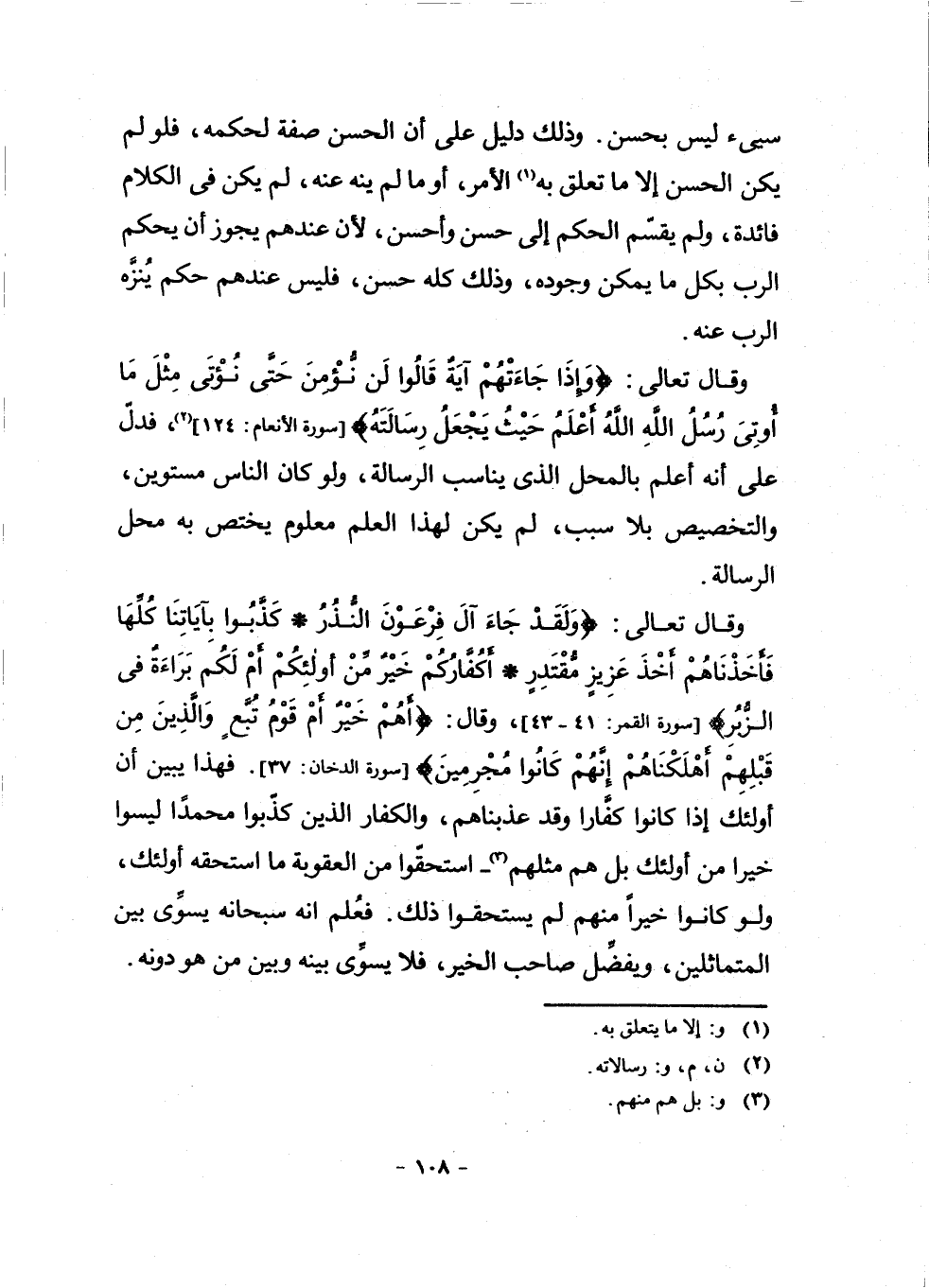 سَيِّئٌ لَيْسَ بِحَسَنٍ. وَذَلِكَ دَلِيلٌ عَلَى أَنَّ الْحُسْنَ صِفَةٌ لِحُكْمِهِ، فَلَوْ لَمْ يَكُنِ الْحُسْنُ إِلَّا مَا تَعَلَّقَ بِهِ (¬1) الْأَمْرُ، أَوْ مَا لَمْ يَنْهَ عَنْهُ؛ لَمْ يَكُنْ فِي الْكَلَامِ فَائِدَةٌ، وَلَمْ يُقَسَّمَ الْحُكْمُ إِلَى حَسَنٍ وَأَحْسَنَ ; لِأَنَّ عِنْدَهُمْ يَجُوزُ أَنْ يَحْكُمَ الرَّبُّ بِكُلِّ مَا يُمْكِنُ وُجُودُهُ، وَذَلِكَ كُلُّهُ حَسَنٌ، فَلَيْسَ عِنْدَهُمْ حُكْمٌ يُنَزَّهُ الرَّبُّ عَنْهُ.