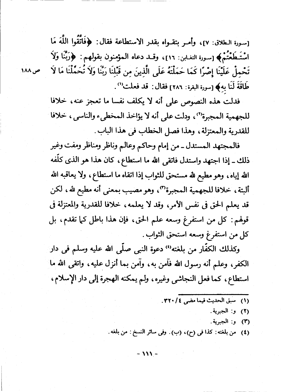 فَالْمُجْتَهِدُ الْمُسْتَدِلُّ مِنْ إِمَامٍ وَحَاكِمٍ وَعَالِمٍ وَنَاظِرٍ وَمُنَاظِرٍ وَمُفْتٍ وَغَيْرِ ذَلِكَ إِذَا اجْتَهَدَ وَاسْتَدَلَّ فَاتَّقَى اللَّهَ مَا اسْتَطَاعَ، كَانَ هَذَا هُوَ الَّذِي كَلَّفَهُ اللَّهُ إِيَّاهُ، وَهُوَ مُطِيعٌ لِلَّهِ مُسْتَحِقٌّ لِلثَّوَابِ إِذَا اتَّقَاهُ مَا اسْتَطَاعَ، وَلَا يُعَاقِبُهُ اللَّهُ الْبَتَّةَ، خِلَافًا لِلْجَهْمِيَّةِ الْمُجَبِّرَةِ (¬3) ، وَهُوَ مُصِيبٌ بِمَعْنَى أَنَّهُ مُطِيعٌ لِلَّهِ، لَكِنْ قَدْ يَعْلَمُ الْحَقَّ فِي نَفْسِ الْأَمْرِ، وَقَدْ لَا يَعْلَمُهُ، خِلَافًا لِلْقَدَرِيَّةِ وَالْمُعْتَزِلَةِ فِي قَوْلِهِمْ: كُلُّ مَنِ اسْتَفْرَغَ وُسْعَهُ عَلِمَ الْحَقَّ، فَإِنَّ هَذَا بَاطِلٌ كَمَا تَقَدَّمَ؛ بَلْ كُلُّ مَنِ اسْتَفْرَغَ وُسْعَهُ اسْتَحَقَّ الثَّوَابَ.