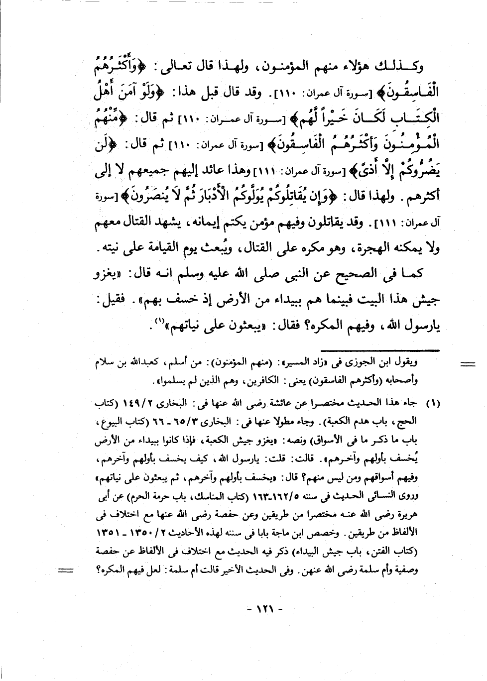 (¬1) جَاءَ هَذَا الْحَدِيثُ مُخْتَصَرًا عَنْ عَائِشَةَ رَضِيَ اللَّهُ عَنْهَا فِي: الْبُخَارِيِّ 2/149 كِتَابُ الْحَجِّ بَابُ هَدْمِ الْكَعْبَةِ، وَجَاءَ مُطَوَّلًا عَنْهَا فِي: الْبُخَارِيِّ 3/65 - 66 كِتَابُ الْبُيُوعِ، بَابُ مَا ذُكِرَ مَا فِي الْأَسْوَاقِ، وَنَصُّهُ: (يَغْزُو جَيْشٌ الْكَعْبَةَ؛ فَإِذَا كَانُوا بِبَيْدَاءَ مِنَ الْأَرْضِ يُخْسَفُ بِأَوَّلِهِمْ وَآخِرِهِمْ) قَالَتْ: قُلْتُ: يَا رَسُولَ اللَّهِ، كَيْفَ يُخْسَفُ بِأَوَّلِهِمْ وَآخِرِهِمْ، وَفِيهِمْ أَسْوَاقُهُمْ وَمَنْ لَيْسَ مِنْهُمْ؟ قَالَ: (يُخْسَفُ بِأَوَّلِهِمْ وَآخِرِهِمْ، ثُمَّ يُبْعَثُونَ عَلَى نِيَّاتِهِمْ) وَرَوَى النَّسَائِيُّ الْحَدِيثَ فِي سُنَنِهِ 5/162 - 163 كِتَابُ الْمَنَاسِكِ، بَابُ حُرْمَةِ الْحَرَمِ عَنْ أَبِي هُرَيْرَةَ رَضِيَ اللَّهُ عَنْهُ مُخْتَصَرًا مِنْ طَرِيقَيْنِ وَعَنْ حَفْصَةَ رَضِيَ اللَّهُ عَنْهَا مَعَ اخْتِلَافٍ فِي الْأَلْفَاظِ مِنْ طَرِيقَيْنِ، وَخَصَّصَ ابْنُ مَاجَهْ بَابًا فِي سُنَنِهِ لِهَذِهِ الْأَحَادِيثِ 2/1350 - 1351 كِتَابُ الْفِتَنِ، بَابُ جَيْشِ الْبَيْدَاءِ، ذَكَرَ فِيهِ الْحَدِيثَ مَعَ اخْتِلَافٍ فِي الْأَلْفَاظِ عَنْ حَفْصَةَ وَصَفِيَّةَ وَأُمِّ سَلَمَةَ رَضِيَ اللَّهُ عَنْهُنَّ، وَفِي الْحَدِيثِ الْأَخِيرِ قَالَتْ أُمُّ سَلَمَةَ: لَعَلَّ فِيهِمُ الْمُكْرَهُ؟ قَالَ: إِنَّهُمْ يُبْعَثُونَ عَلَى نِيَّاتِهِمْ. وَالْحَدِيثُ عَنْهَا رَضِيَ اللَّهُ عَنْهَا فِي الْمُسْنَدِ (ط. الْحَلَبِيِّ) . 6/318