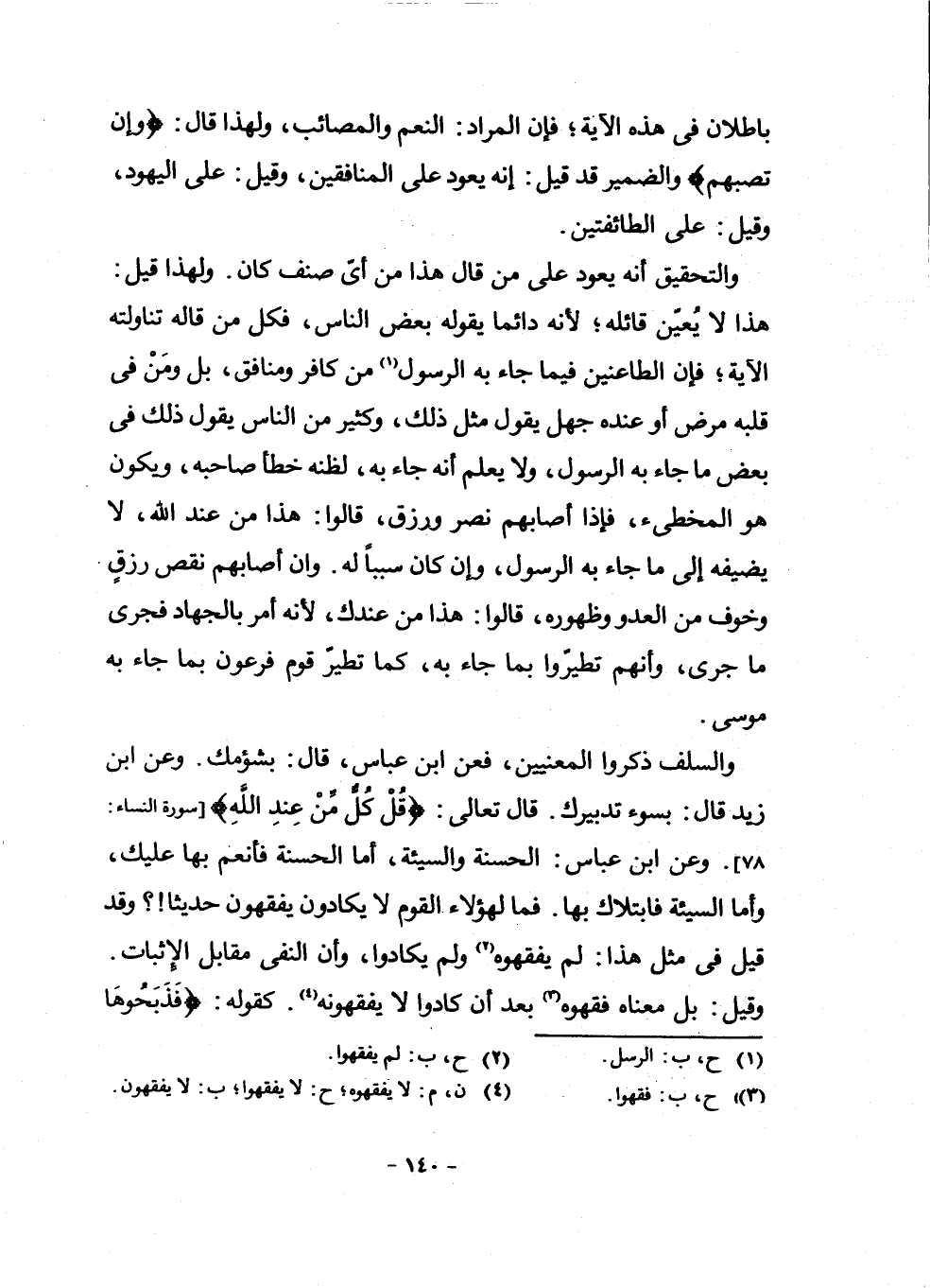 وَالسَّلَفُ ذَكَرُوا الْمَعْنَيَيْنِ، فَعَنِ ابْنِ عَبَّاسٍ، قَالَ: بِشُؤْمِكَ. وَعَنِ ابْنِ زَيْدٍ قَالَ: بِسُوءِ تَدْبِيرِكَ. قَالَ تَعَالَى: {قُلْ كُلٌّ مِنْ عِنْدِ اللَّهِ} [سُورَةُ النِّسَاءِ 78] . وَعَنِ ابْنِ عَبَّاسٍ: الْحَسَنَةُ وَالسَّيِّئَةُ، أَمَّا الْحَسَنَةُ فَأَنْعَمَ بِهَا عَلَيْكَ، وَأَمَّا السَّيِّئَةُ فَابْتَلَاكَ بِهَا. فَمَا لِهَؤُلَاءِ الْقَوْمِ لَا يَكَادُونَ يَفْقَهُونَ حَدِيثًا! ؟ وَقَدْ قِيلَ فِي مِثْلِ هَذَا: لَمْ يَفْقَهُوهُ (¬2) وَلَمْ يَكَادُوا، وَأَنَّ النَّفْيَ مُقَابِلُ الْإِثْبَاتِ. وَقِيلَ: بَلْ مَعْنَاهُ فَقِهُوهُ (¬3) بَعْدَ أَنْ كَادُوا لَا يَفْقَهُونَهُ (¬4) . كَقَوْلِهِ