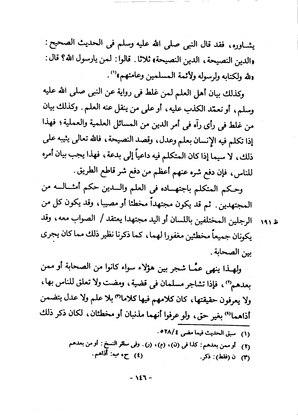 وَكَذَلِكَ بَيَانُ أَهْلِ الْعِلْمِ لِمَنْ غَلِطَ فِي رِوَايَةٍ عَنِ النَّبِيِّ - صَلَّى اللَّهُ عَلَيْهِ وَسَلَّمَ - أَوْ تَعَمَّدَ الْكَذِبَ عَلَيْهِ، أَوْ عَلَى مَنْ يَنْقِلُ عَنْهُ الْعِلْمَ. وَكَذَلِكَ بَيَانُ مَنْ غَلِطَ فِي رَأْيٍ رَآهُ فِي أَمْرِ الدِّينِ مِنَ الْمَسَائِلِ الْعِلْمِيَّةِ وَالْعَمَلِيَّةِ ; فَهَذَا إِذَا تَكَلَّمَ فِيهِ الْإِنْسَانُ بِعِلْمٍ وَعَدْلٍ، وَقَصَدَ النَّصِيحَةَ، فَاللَّهُ تَعَالَى يُثِيبُهُ عَلَى ذَلِكَ، لَا سِيَّمَا إِذَا كَانَ الْمُتَكَلِّمُ فِيهِ دَاعِيًا إِلَى بِدْعَةٍ، فَهَذَا يَجِبُ بَيَانُ أَمْرِهِ لِلنَّاسِ، فَإِنَّ دَفْعَ شَرِّهِ عَنْهُمْ أَعْظَمُ مِنْ دَفْعِ شَرِّ قَاطِعِ الطَّرِيقِ.