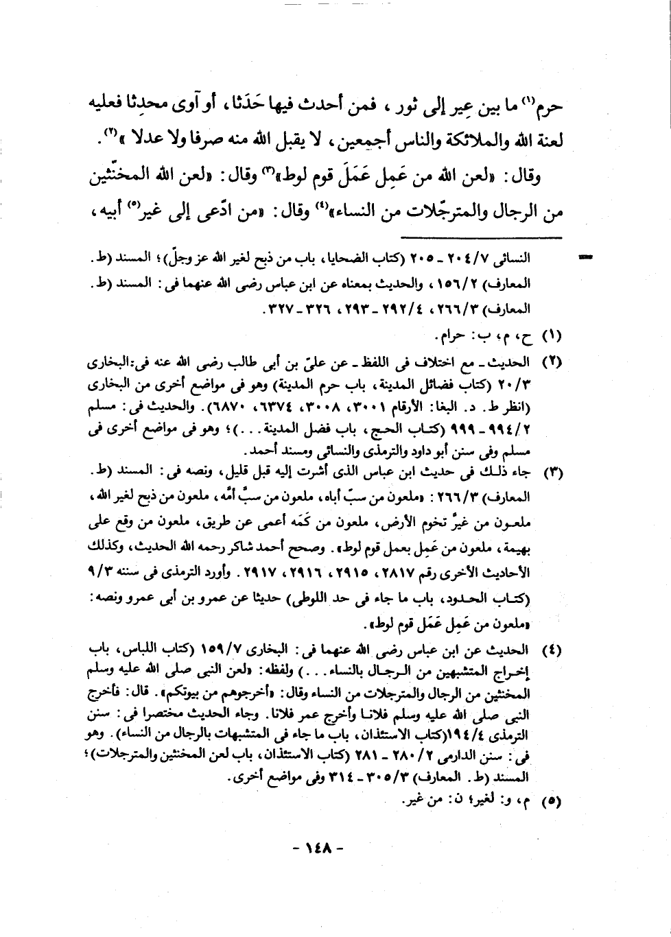 (¬3) جَاءَ ذَلِكَ فِي حَدِيثِ ابْنِ عَبَّاسٍ الَّذِي أَشَرْتُ إِلَيْهِ قَبْلَ قَلِيلٍ، وَنَصُّهُ فِي: الْمُسْنَدِ ط. الْمَعَارِفِ 3/266: (مَلْعُونٌ مَنْ سَبَّ أَبَاهُ، مَلْعُونٌ مَنْ سَبَّ أُمَّهُ، مَلْعُونٌ مَنْ ذَبَحَ لِغَيْرِ اللَّهِ، مَلْعُونٌ مَنْ غَيَّرَ تُخُومَ الْأَرْضِ، مَلْعُونٌ مَنْ كَمَّهَ أَعْمَى عَنْ طَرِيقٍ، مَلْعُونٌ مَنْ وَقَعَ عَلَى بَهِيمَةٍ، مَلْعُونٌ مَنْ عَمَلَ بِعَمَلِ قَوْمِ لُوطٍ) وَصَحَّحَ أَحْمَدُ شَاكِر رَحِمَهُ اللَّهُ الْحَدِيثَ، وَكَذَلِكَ الْأَحَادِيثَ الْأُخْرَى رَقْمَ 2817، 2915، 2916، 2917 وَأَوْرَدَ التِّرْمِذِيُّ فِي سُنَنِهِ 3/9 كِتَابُ الْحُدُودِ، بَابُ مَا جَاءَ فِي حَدِّ اللُّوطِيِّ حَدِيثًا عَنْ عَمْرِو بْنِ أَبِي عَمْرٍو وَنَصُّهُ: (مَلْعُونٌ مَنْ عَمِلَ عَمَلَ قَوْمِ لُوطٍ)