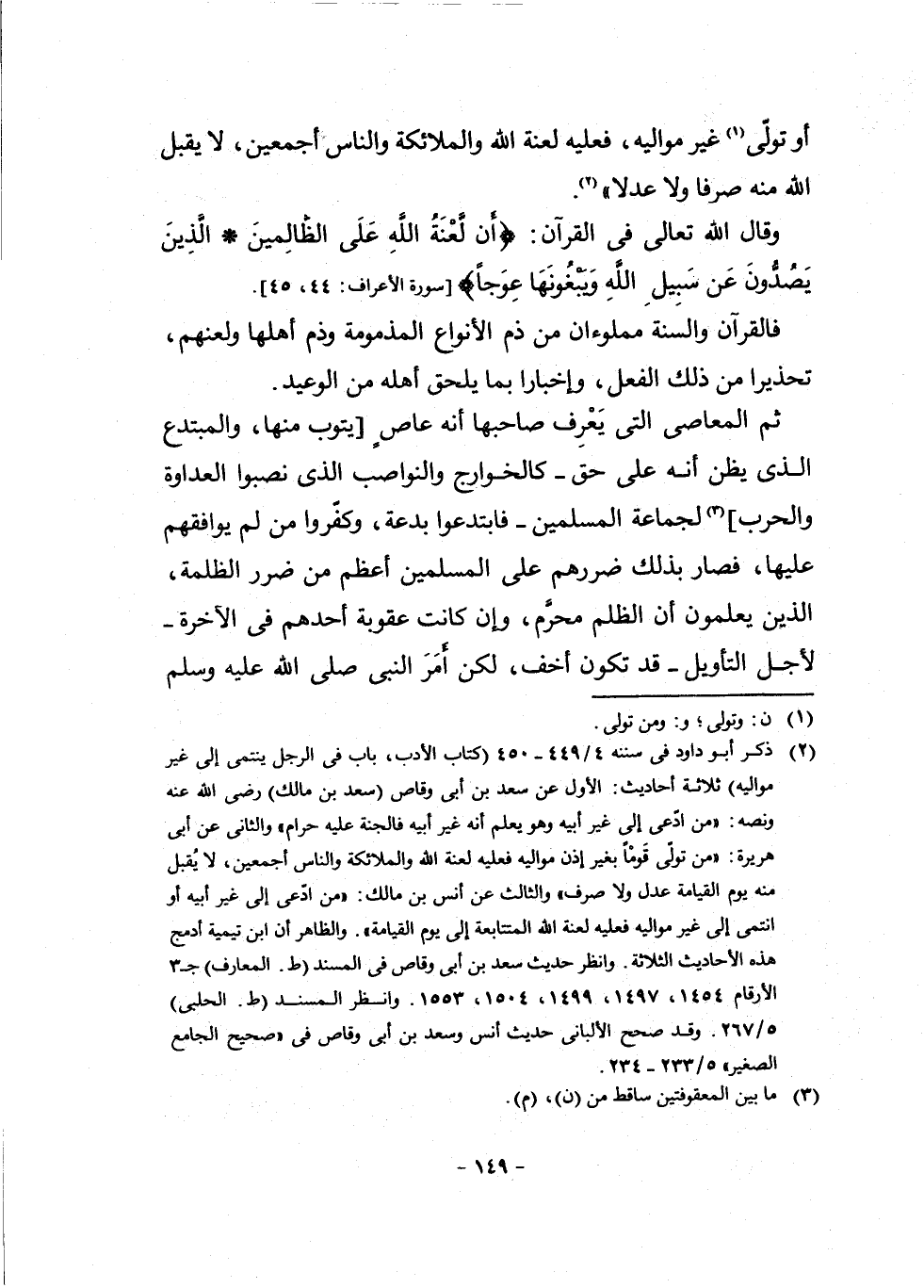 (¬2) ذَكَرَ أَبُو دَاوُدَ فِي سُنَنِهِ 4/449 - 450 كِتَابُ الْأَدَبِ، بَابٌ فِي الرَّجُلِ يَنْتَمِي إِلَى غَيْرِ مَوَالِيهِ ثَلَاثَ أَحَادِيثَ: الْأَوَّلُ عَنْ سَعْدِ بْنِ أَبِي وَقَّاصٍ (سَعْدِ بْنِ مَالِكٍ) رَضِيَ اللَّهُ عَنْهُ وَنَصُّهُ: (مَنِ ادَّعَى إِلَى غَيْرِ أَبِيهِ وَهُوَ يَعْلَمُ أَنَّهُ غَيْرُ أَبِيهِ فَالْجَنَّةُ عَلَيْهِ حَرَامٌ) ، وَالثَّانِي عَنْ أَبِي هُرَيْرَةَ: (مَنْ تَوَلَّى قَوْمًا بِغَيْرِ إِذَنْ مَوَالِيهِ فَعَلَيْهِ لَعْنَةُ اللَّهِ وَالْمَلَائِكَةِ وَالنَّاسِ أَجْمَعِينَ، لَا يُقْبَلُ مِنْهُ يَوْمَ الْقِيَامَةِ عَدْلٌ وَلَا صَرْفٌ) وَالثَّالِثُ عَنْ أَنَسِ بْنِ مَالِكٍ: (مَنِ ادَّعَى إِلَى غَيْرِ أَبِيهِ أَوِ انْتَمَى إِلَى غَيْرِ مَوَالِيهِ فَعَلَيْهِ لَعْنَةُ اللَّهِ الْمُتَتَابِعَةُ إِلَى يَوْمِ الْقِيَامَةِ) وَالظَّاهِرُ أَنَّ ابْنَ تَيْمِيَّةَ أَدْمَجَ هَذِهِ الْأَحَادِيثَ الثَّلَاثَةَ، وَانْظُرْ حَدِيثَ سَعْدِ بْنِ أَبِي وَقَّاصٍ فِي الْمُسْنَدِ ط. الْمَعَارِفِ ج [0 - 9] الْأَرْقَامَ 1454، 1497، 1499، 1504، 1553 وَانْظُرِ الْمُسْنَدَ ط. الْحَلَبِيِّ 5/267 وَقَدْ صَحَّحَ الْأَلْبَانِيُّ حَدِيثَ أَنَسٍ وَسَعْدِ بْنِ أَبِي وَقَّاصٍ فِي صَحِيحِ الْجَامِعِ الصَّغِيرِ 5/233 - 234