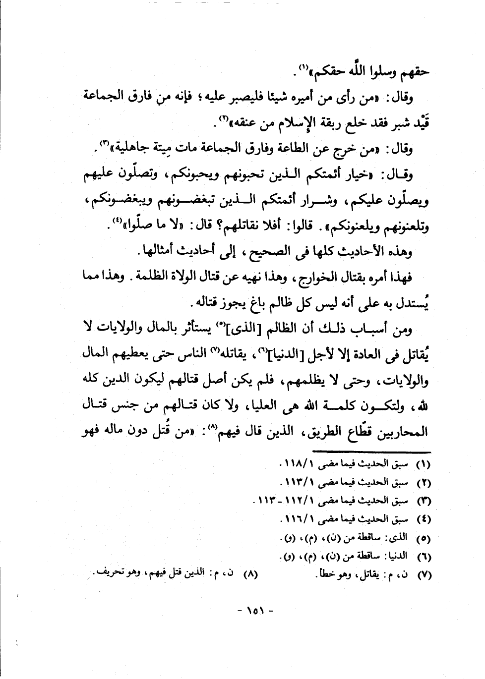 فَهَذَا أَمْرُهُ بِقِتَالِ الْخَوَارِجِ، وَهَذَا نَهْيُهُ عَنْ قِتَالِ الْوُلَاةِ الظَّلَمَةِ. وَهَذَا مِمَّا يُسْتَدَلُّ بِهِ عَلَى أَنَّهُ لَيْسَ كُلُّ ظَالِمٍ بَاغٍ يَجُوزُ قِتَالُهُ.