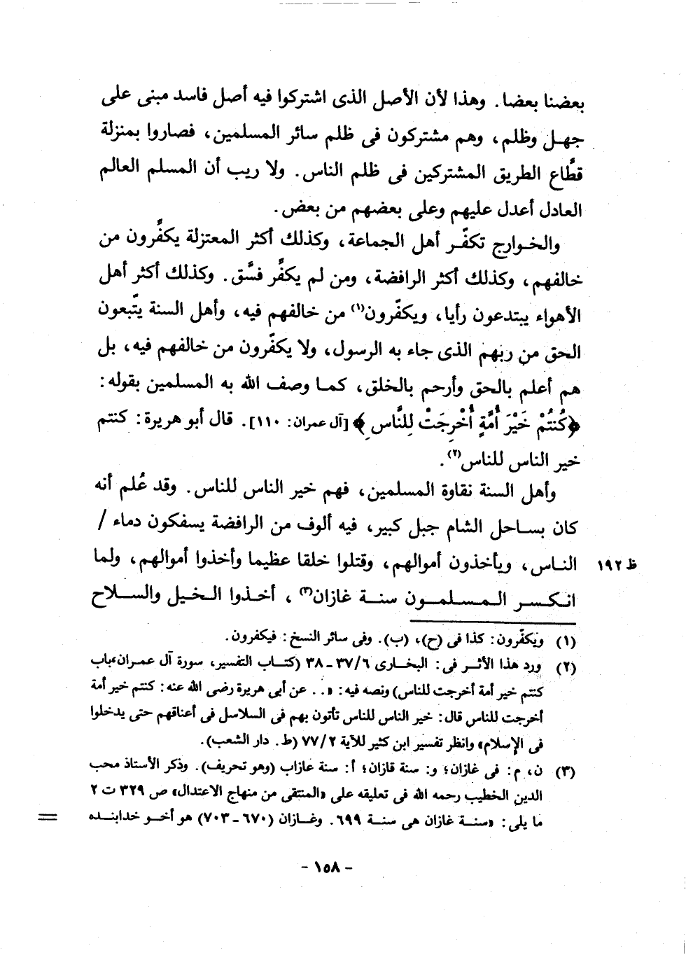 (¬3) ن، م: فِي غَازَانَ، و: سَنَةَ قَازَانَ، أ: سَنَةَ عَازَابَ، وَهُوَ تَحْرِيفٌ وَذَكَرَ الْأُسْتَاذُ مُحِبُّ الدِّينِ الْخَطِيبُ رَحِمَهُ اللَّهُ فِي تَعْلِيقِهِ عَلَى الْمُنْتَقَى مِنْ مِنْهَاجِ الِاعْتِدَالِ ص 329 ت [0 - 9] مَا يَلِي: سَنَةَ غَازَانَ هِيَ سَنَةُ 699 وَغَازَانُ 670 - 703 هُوَ أَخُو خَدَابِنَدَاهُ 680 - 716 الَّذِي أَلَّفَ لَهُ الرَّافِضِيُّ الْكِتَابَ الْمَرْدُودَ عَلَيْهِ، وَقَدْ تَقَدَّمَ التَّعْرِيفُ بِهِ وَبِأَسْلَافِهِ فِي التَّعْلِيقِ عَلَى خُطْبَةِ هَذَا الْكِتَابِ ص 18 وَالْوَاقِعَةُ الَّتِي أَشَارَ إِلَيْهَا شَيْخُ الْإِسْلَامِ هِيَ أَنَّ دِمَشْقَ كَانَتْ فِي ذَلِكَ الْحِينِ تَابِعَةً لِلْمَلِكَةِ الْمِصْرِيَّةِ، وَكَانَ مَلِكُ مِصْرَ النَّاصِرُ مُحَمَّدُ بْنُ قَلَاوُونَ الَّذِي عَادَ مِنْ مَنْفَاهُ بِالْكَرْكَ بَعْدَ قَتْلِ الْمَنْصُورِ لَاجِينَ فِي السَّنَةِ الْمَاضِيَةِ 698 وَكَانَ نَائِبُ السُّلْطَانِ الْمِصْرِيِّ فِي دِمَشْقَ وَبِلَادِ الشَّامِ آقُوشَ الْأَفْرَمَ بَعْدَ أَنْ فَرَّ سَلَفُهُ سَيْفُ الدِّينِ قَبْجَقُ الْمَنْصُورِيُّ إِلَى إِيرَانَ وَالْتَحَقَ بِمَلِكِهَا غَازَانَ الْمَذْكُورِ، فَوَرَدَتِ الْأَخْبَارُ فِي أَوَاخِرِ سَنَةِ 698 بِزَحْفِ غَازَانَ مِنْ إِيرَانَ نَحْوَ حَلَبَ، وَعَلِمَ بِذَلِكَ النَّاصِرُ مُحَمَّدُ بْنُ قَلَاوُونَ فَخَرَجَ مِنْ مِصْرَ إِلَى غَزَّةَ فِي مُحَرَّمٍ 699 وَلَبِثَ فِيهَا شَهْرَيْنِ يَسْتَعِدُّ وَيُرَاقِبُ حَرَكَاتِ غَازَانَ، وَفِي رَبِيعٍ الْأَوَّلِ 699 وَصَلَ النَّاصِرُ إِلَى دِمَشْقَ، وَكَانَ الْوَقْتُ شِتَاءَ دِيسِمْبِرَ 1219 م فَتَمَوَّنَ مِنْ دِمَشْقَ بِالرِّجَالِ وَالْأَمْوَالِ وَالْعَتَادِ حَتَّى اقْتَرَضُوا أَمْوَالَ الْأَيْتَامِ، وَزَحَفَ إِلَى الشَّمَالِ، فَالْتَقَى بِالتَّتَارِ فِي وَادِي سَلَمْيَةَ يَوْمَ 27 رَبِيعٍ الْأَوَّلِ 699 وَكَانَتْ مَلْحَمَةً انْكَسَرَتْ فِيهَا جُيُوشُ النَّاصِرِ مُحَمَّدِ بْنِ قَلَاوُونَ، وَوَاصَلَ غَازَانُ زَحْفَهُ فَاسْتَوْلَى عَلَى بَعْلَبَكَّ وَالْبِقَاعِ، فَنَزَحَ أَعْيَانُ دِمَشْقَ إِلَى مِصْرَ يَتَّبِعُونَ الْمَلِكَ النَّاصِرَ فِي انْسِحَابِهِ، وَبَقِيَتْ دِمَشْقُ بِلَا رُعَاةٍ، وَالْتَفَّ الشَّامِيُّونَ حَوْلَ شَيْخِ الْإِسْلَامِ ابْنِ تَيْمِيَّةَ يَطْلُبُونَ مِنْهُ الْخُرُوجَ لِمُقَابَلَةِ غَازَانَ وَطَلَبِ الْأَمَانِ لِلشَّعْبِ، وَذَكَرَ الْأُسْتَاذُ مُحِبُّ الدِّينِ بَعْدَ ذَلِكَ مَا جَرَى بَيْنَ ابْنِ تَيْمِيَّةَ وَغَازَانَ فِي لِقَاءٍ بَيْنِهِمَا، ثُمَّ ذَكَرَ مَا جَرَى مِنَ التَّتَارِ بَعْدَ ذَلِكَ حَتَّى أَوَاسِطِ شَعْبَانَ سَنَةَ 699 انْظُرْ هَامِشَ ص 330 - 332 وَانْظُرْ عَنْ سَنَةِ غَازَانَ أَوْ وَقْعَةِ غَازَانَ: الْبِدَايَةَ وَالنِّهَايَةَ 14/6 - 11.