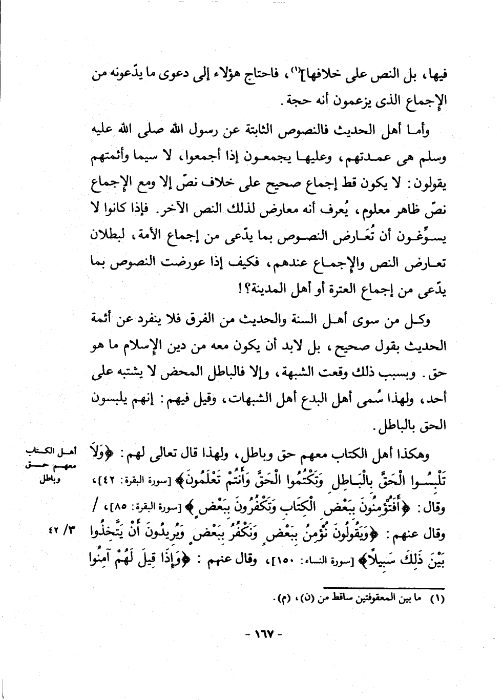 وَأَمَّا أَهْلُ الْحَدِيثِ فَالنُّصُوصُ الثَّابِتَةُ عَنْ رَسُولِ اللَّهِ - صَلَّى اللَّهُ عَلَيْهِ وَسَلَّمَ - هِيَ عُمْدَتُهُمْ، وَعَلَيْهَا يَجْمَعُونَ إِذَا أَجْمَعُوا، لَا سِيَّمَا وَأَئِمَّتُهُمْ يَقُولُونَ: لَا يَكُونُ قَطُّ إِجْمَاعٌ صَحِيحٌ عَلَى خِلَافِ نَصٍّ إِلَّا وَمَعَ الْإِجْمَاعِ نَصٌّ ظَاهِرٌ مَعْلُومٌ، يُعْرَفُ أَنَّهُ مُعَارِضٌ لِذَلِكَ النَّصِّ الْآخَرِ. فَإِذَا كَانُوا لَا يُسَوِّغُونَ أَنْ تُعَارَضَ النُّصُوصُ بِمَا يُدَّعَى مِنْ إِجْمَاعِ الْأُمَّةِ، لِبُطْلَانِ تَعَارُضِ النَّصِّ وَالْإِجْمَاعِ عِنْدَهُمْ، فَكَيْفَ إِذَا عُورِضَتِ النُّصُوصُ بِمَا يُدَّعَى مِنْ إِجْمَاعِ الْعِتْرَةِ أَوْ أَهْلِ الْمَدِينَةِ؟ .