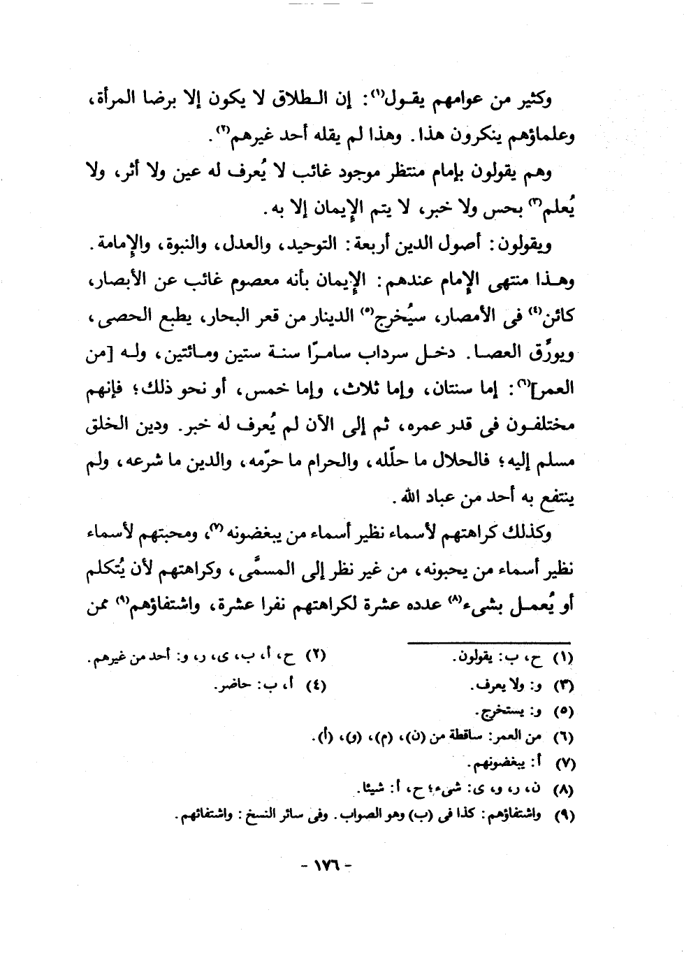 وَهُمْ يَقُولُونَ بِإِمَامٍ مُنْتَظَرٍ مَوْجُودٍ غَائِبٍ لَا يُعْرَفُ لَهُ عَيْنٌ وَلَا أَثَرٌ، وَلَا يُعْلَمُ (¬3) بِحِسٍّ وَلَا خَبَرٍ، لَا يَتِمُّ الْإِيمَانُ إِلَّا بِهِ.