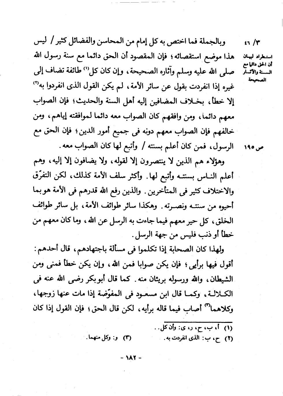وَهَؤُلَاءِ هُمُ الَّذِينَ لَا يَنْتَصِرُونَ إِلَّا لِقَوْلِهِ، وَلَا يُضَافُونَ إِلَّا إِلَيْهِ، وَهُمْ أَعْلَمُ النَّاسِ بِسُنَّتِهِ وَأَتْبَعُ لَهَا. وَأَكْثَرُ سَلَفِ الْأُمَّةِ كَذَلِكَ، لَكِنَّ التَّفَرُّقَ وَالِاخْتِلَافَ كَثِيرٌ فِي الْمُتَأَخِّرِينَ. وَالَّذِينَ رَفَعَ اللَّهُ قَدْرَهُمْ فِي الْأُمَّةِ هُوَ بِمَا أَحْيَوْهُ مِنْ سُنَّتِهِ وَنُصْرَتِهِ. وَهَكَذَا سَائِرُ طَوَائِفِ الْأُمَّةِ،، بَلْ سَائِرُ طَوَائِفِ الْخَلْقِ، كُلٌّ حُيِّرَ مَعَهُمْ فِيمَا جَاءَتْ بِهِ الرُّسُلُ عَنِ اللَّهِ، وَمَا كَانَ مَعَهُمْ مِنْ خَطَأٍ أَوْ ذَنْبٍ فَلَيْسَ مِنْ جِهَةِ الرُّسُلِ.