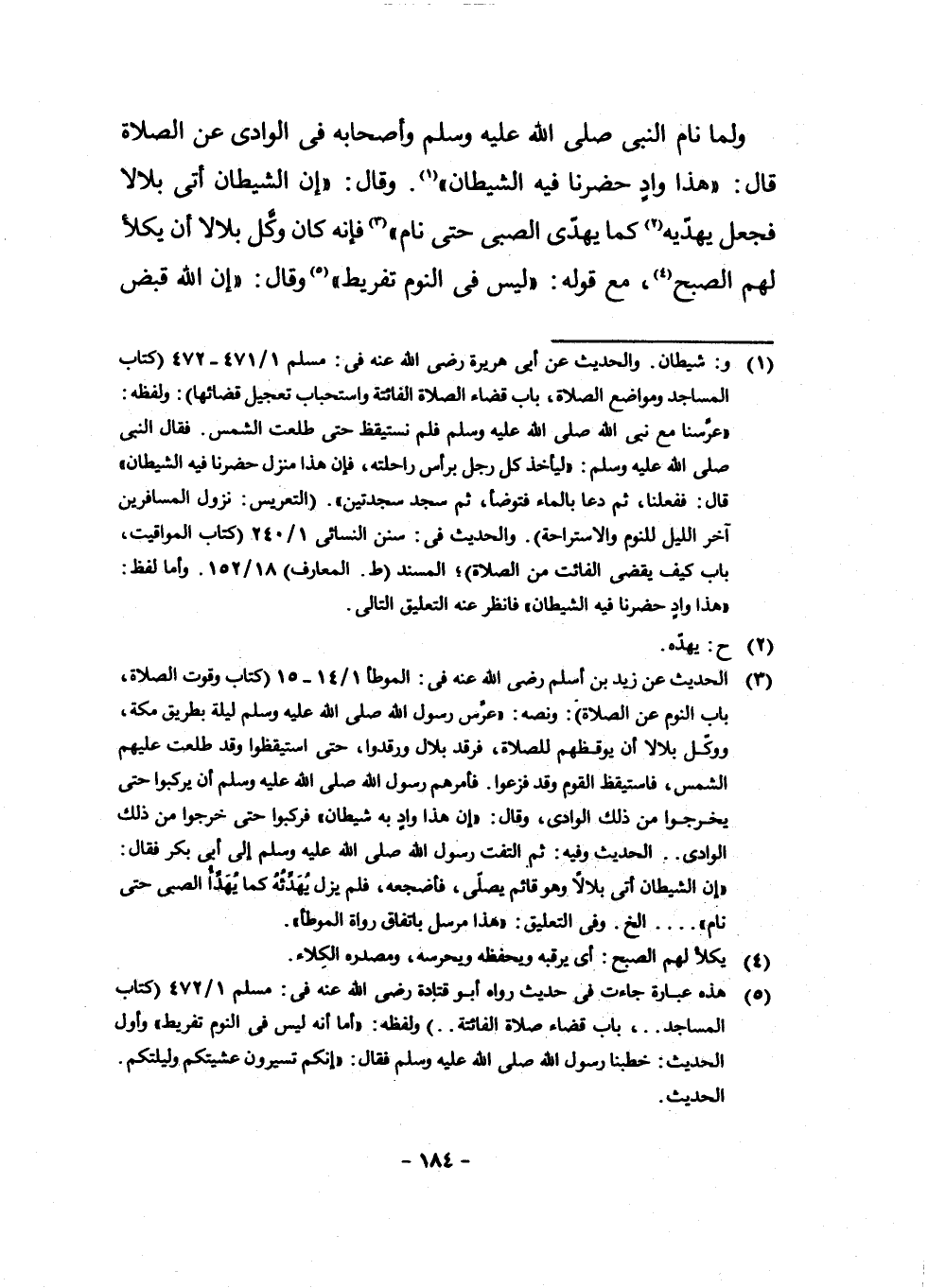 (¬1) و: شَيْطَانٌ، وَالْحَدِيثُ عَنْ أَبِي هُرَيْرَةَ رَضِيَ اللَّهُ عَنْهُ فِي مُسْلِمٍ: 1/471 - 472 كِتَابُ الْمَسَاجِدِ وَمَوَاضِعِ الصَّلَاةِ، بَابُ قَضَاءِ الصَّلَاةِ الْفَائِتَةِ وَاسْتِحْبَابِ تَعْجِيلِ قَضَائِهَا، وَلَفْظُهُ: (عَرَّسْنَا مَعَ نَبِيِّ اللَّهِ صَلَّى اللَّهُ عَلَيْهِ وَسَلَّمَ فَلَمْ نَسْتَيْقِظْ حَتَّى طَلَعَتِ الشَّمْسُ، فَقَالَ النَّبِيُّ صَلَّى اللَّهُ عَلَيْهِ وَسَلَّمَ: (لِيَأْخُذْ كُلُّ رَجُلٍ بِرَأْسِ رَاحِلَتِهِ، فَإِنَّ هَذَا مَنْزِلٌ حَضَرَنَا فِيهِ الشَّيْطَانُ) قَالَ: فَفَعَلْنَا، ثُمَّ دَعَا بِالْمَاءِ فَتَوَضَّأَ، ثُمَّ سَجَدَ سَجْدَتَيْنِ) التَّعْرِيسُ: نُزُولُ الْمُسَافِرِينَ آخِرَ اللَّيْلِ لِلنَّوْمِ وَالِاسْتِرَاحَةِ، وَالْحَدِيثُ فِي سُنَنِ النَّسَائِيِّ 1/240 كِتَابُ الْمَوَاقِيتِ بَابُ كَيْفَ يَقْضِي الْفَائِتَ مِنَ الصَّلَاةِ، الْمُسْنَدَ ط. الْمَعَارِفِ 18/152 وَأَمَّا لَفْظُ هَذَا وَادٍ حَضَرْنَا فِيهِ الشَّيْطَانُ، فَانْظُرْ عَنْهُ التَّعْلِيقَ التَّالِي.