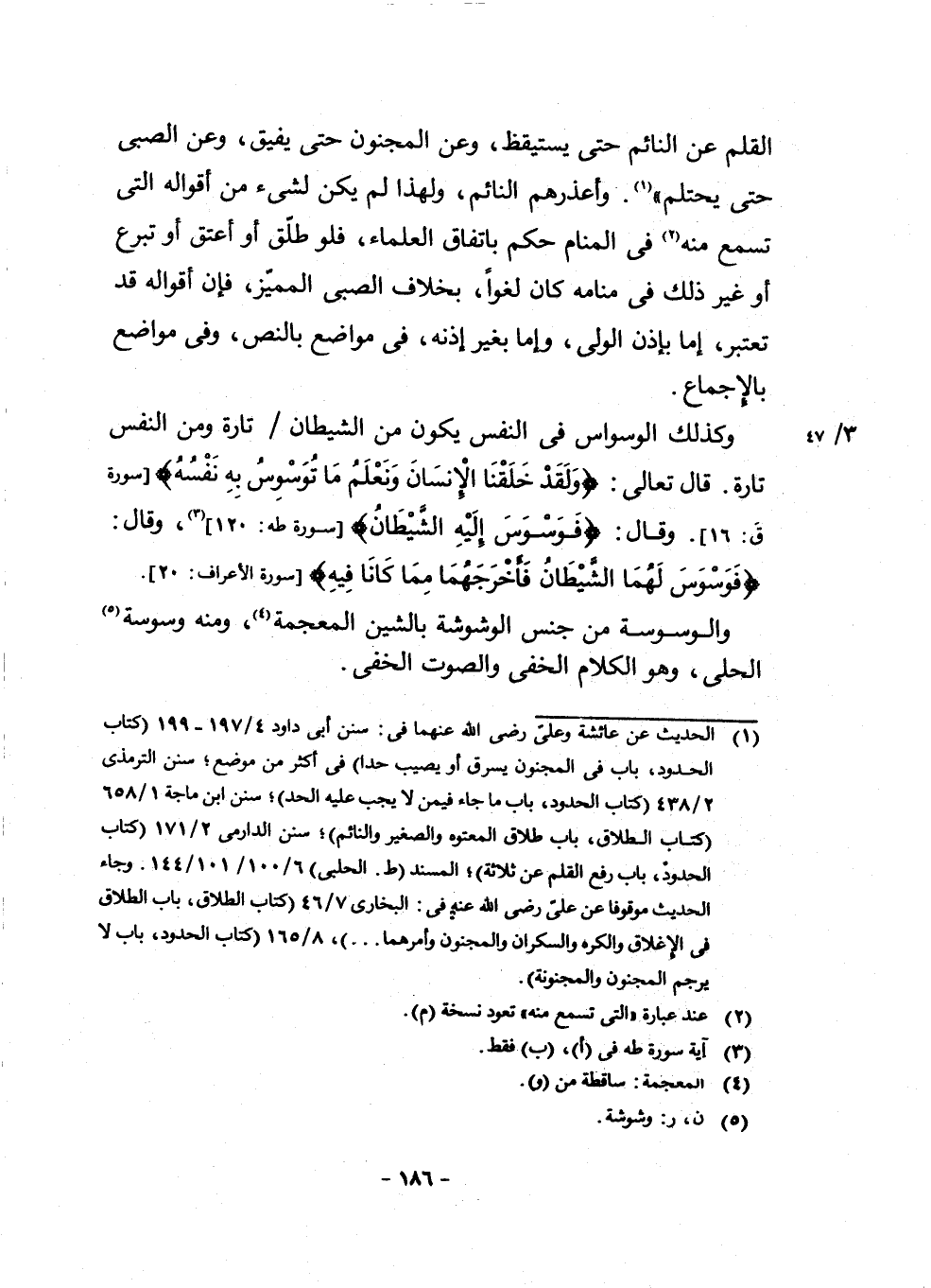(¬1) الْحَدِيثَ عَنْ عَائِشَةَ وَعَلِيٍّ رَضِيَ اللَّهُ عَنْهُمَا فِي: سُنَنِ أَبِي دَاوُدَ 4/197 - 199 كِتَابُ الْحُدُودِ، بَابٌ فِي الْمَجْنُونِ يَسْرِقُ أَوْ يُصِيبُ حَدًّا، فِي أَكْثَرِ مِنْ مَوْضِعٍ، سُنَنَ التِّرْمِذِيِّ 2/438 كِتَابُ الْحُدُودِ بَابُ مَا جَاءَ فِيمَنْ لَا يَجِبُ عَلَيْهِ الْحَدُّ، سُنَنَ ابْنِ مَاجَهْ 1/658 كِتَابُ الطَّلَاقِ بَابُ طَلَاقِ الْمَعْتُوهِ وَالصَّغِيرِ وَالنَّائِمِ، سُنَنَ الدَّارِمِيِّ 2/171 كِتَابُ الْحُدُودِ بَابُ رُفِعَ الْقَلَمُ عَنْ ثَلَاثَةٍ، الْمُسْنَدَ ط. الْحَلَبِيِّ 6/100 101 144 وَجَاءَ الْحَدِيثُ مَوْقُوفًا عَنْ عَلِيٍّ رَضِيَ اللَّهُ عَنْهُ، فِي الْبُخَارِيِّ 7/46 كِتَابُ الطَّلَاقِ بَابُ الطَّلَاقِ فِي الْإِغْلَاقِ وَالْكُرْهِ وَالسَّكْرَانِ وَالْمَجْنُونِ وَأَمْرُهُمَا. 8/165 كِتَابُ الْحُدُودِ، بَابٌ لَا يُرْجَمُ الْمَجْنُونُ وَالْمَجْنُونَةُ.