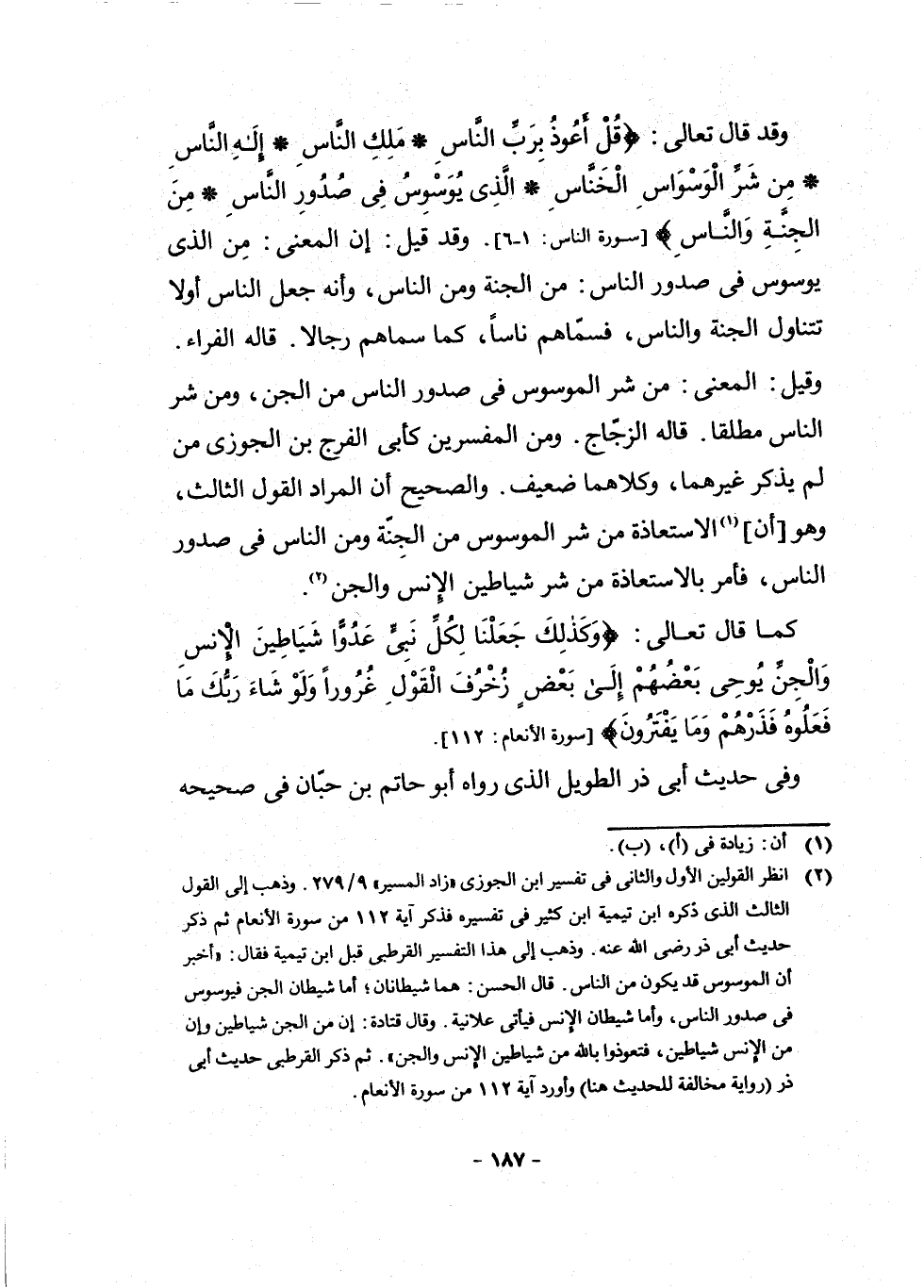 (¬2) انْظُرِ الْقَوْلَيْنِ الْأَوَّلَ وَالثَّانِي فِي تَفْسِيرِ ابْنِ الْجَوْزِيِّ زَادَ الْمَسِيرِ 9/279 وَذَهَبَ إِلَى الْقَوْلِ الثَّالِثِ الَّذِي ذَكَرَهُ ابْنُ تَيْمِيَّةَ ابْنُ كَثِيرٍ فِي تَفْسِيرِهِ فَذَكَرَ آيَةَ 112 مِنْ سُورَةِ الْأَنْعَامِ ثُمَّ ذَكَرَ حَدِيثَ أَبِي ذَرٍّ رَضِيَ اللَّهُ عَنْهُ، وَذَهَبَ إِلَى هَذَا التَّفْسِيرِ الْقُرْطُبِيُّ قَبْلَ ابْنِ تَيْمِيَّةَ فَقَالَ: (أَخْبَرَ أَنَّ الْمُوَسْوِسَ قَدْ يَكُونُ مِنَ النَّاسِ قَالَ الْحَسَنُ: هُمَا شَيْطَانَانِ، أَمَّا شَيْطَانُ الْجِنِّ فَيُوَسْوِسُ فِي صُدُورِ النَّاسِ، وَأَمَّا شَيْطَانُ الْإِنْسِ فَيَأْتِي عَلَانِيَةً، وَقَالَ قَتَادَةُ، إِنَّ مِنَ الْجِنِّ شَيَاطِينَ وَإِنَّ مِنَ الْإِنْسِ شَيَاطِينَ، فَتَعَوَّذُوا بِاللَّهِ مِنْ شَيَاطِينِ الْإِنْسِ وَالْجِنِّ، ثُمَّ ذَكَرَ الْقُرْطُبِيُّ حَدِيثَ أَبِي ذَرٍّ، رِوَايَةً مُخَالِفَةً لِلْحَدِيثِ هُنَا، وَأَوْرَدَ آيَةَ 112 مِنْ [سُورَةِ الْأَنْعَامِ] .