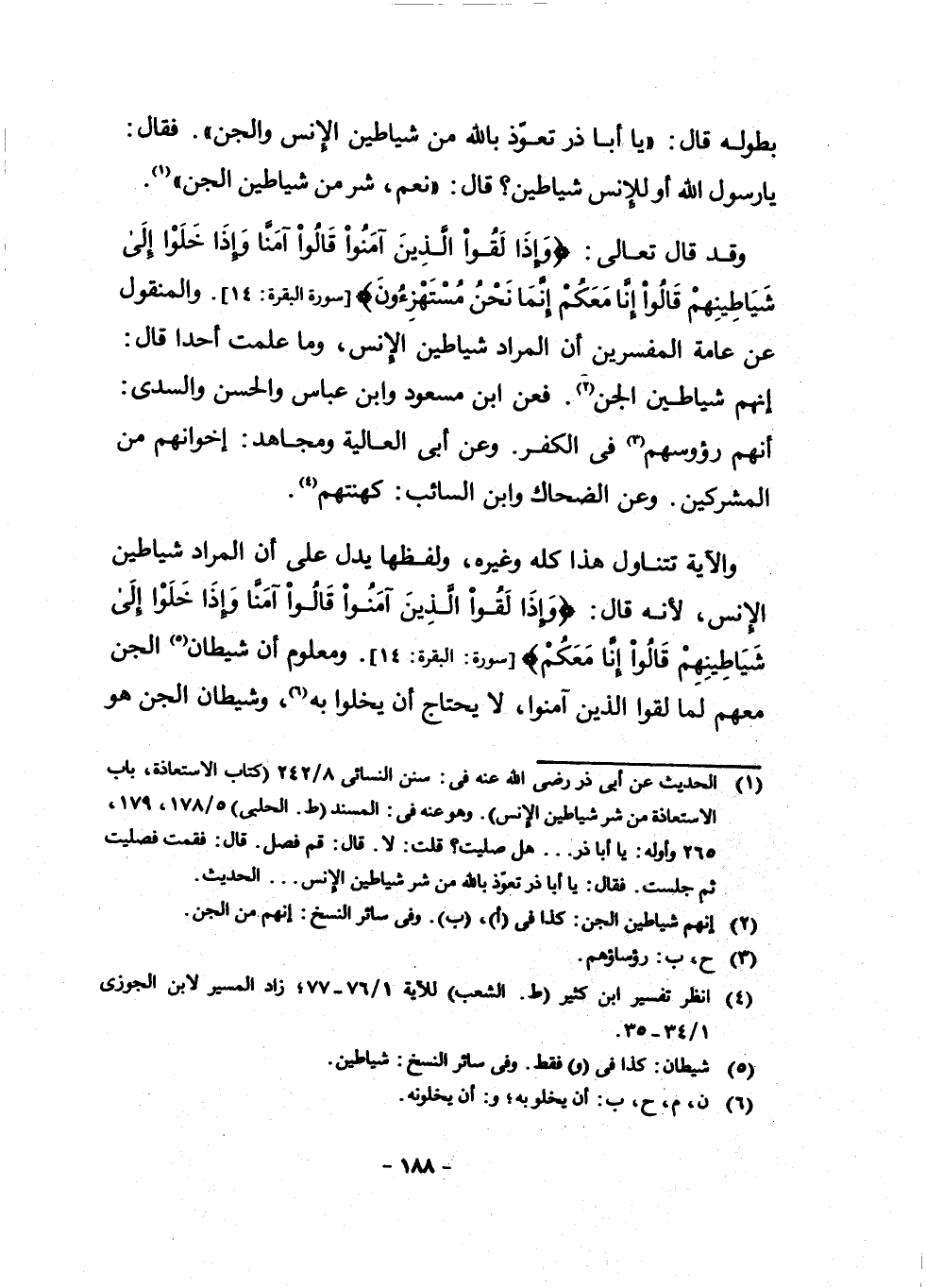 (¬1) الْحَدِيثُ عَنْ أَبِي ذَرٍّ رَضِيَ اللَّهُ عَنْهُ فِي سُنَنِ النَّسَائِيِّ 8/242 كِتَابُ الِاسْتِعَاذَةِ، بَابُ الِاسْتِعَاذَةِ مِنْ شَرِّ شَيَاطِينِ الْإِنْسِ وَهُوَ عَنْهُ فِي: الْمُسْنَدِ ط. الْحَلَبِيِّ 5/178، 179، 265 وَأَوَّلُهُ: يَا أَبَا ذَرٍّ، هَلْ صَلَّيْتَ؟ قُلْتُ: لَا، قَالَ: قُمْ فَصَلِّ. قَالَ: فَقُمْتُ فَصَلَّيْتُ ثُمَّ جَلَسْتُ، فَقَالَ: يَا أَبَا ذَرٍّ، تَعَوَّذْ بِاللَّهِ مِنْ شَرِّ شَيَاطِينِ الْإِنْسِ. . . الْحَدِيثَ.