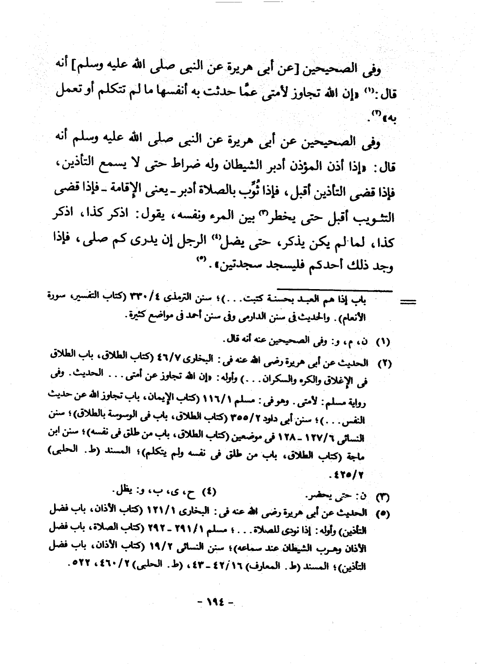 (¬2) الْحَدِيثُ عَنْ أَبِي هُرَيْرَةَ رَضِيَ اللَّهُ عَنْهُ فِي: الْبُخَارِيِّ 7/46 كِتَابُ الطَّلَاقِ، بَابُ الطَّلَاقِ فِي الْإِغْلَاقِ وَالْكُرْهِ وَالسَّكْرَانِ، وَأَوَّلُهُ: (إِنَّ اللَّهَ تَجَاوَزَ عَنْ أُمَّتِي) الْحَدِيثَ وَفِي رِوَايَةِ مُسْلِمٍ: لِأُمَّتِي، وَهُوَ فِي مُسْلِمٍ 1/116 كِتَابُ الْإِيمَانِ، بَابُ تَجَاوُزِ اللَّهِ عَنْ حَدِيثِ النَّفْسِ. سُنَنَ أَبِي دَاوُدَ 2/355 كِتَابُ الطَّلَاقِ، بَابٌ فِي الْوَسْوَسَةِ بِالطَّلَاقِ، سُنَنَ النَّسَائِيِّ 6/127 - 128 فِي مَوْضِعَيْنِ كِتَابُ الطَّلَاقِ بَابُ مَنْ طَلَّقَ فِي نَفْسِهِ، سُنَنَ ابْنِ مَاجَهْ كِتَابُ الطَّلَاقِ، بَابُ مَنْ طَلَّقَ فِي نَفْسِهِ وَلَمْ يَتَكَلَّمْ، الْمُسْنَدَ ط. الْحَلَبِيِّ 2/425)
