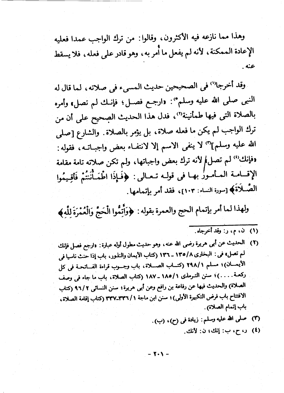 (¬3) الْحَدِيثُ عَنْ أَبِي هُرَيْرَةَ رَضِيَ اللَّهُ عَنْهُ، وَهُوَ حَدِيثٌ مُطَوَّلٌ أَوَّلُهُ عِبَارَةُ: ارْجِعْ فَصَلِّ فَإِنَّكَ لَمْ تُصَلِّ. فِي الْبُخَارِيِّ 8/135 - 136 كِتَابُ الْأَيْمَانِ وَالنُّذُورِ، بَابُ إِذَا حَنَثَ نَاسِيًا فِي الْأَيْمَانِ، مُسْلِمٍ 1/298 كِتَابُ الصَّلَاةِ، بَابُ وُجُوبِ قِرَاءَةِ الْفَاتِحَةِ فِي كُلِّ رَكْعَةٍ، سُنَنَ التِّرْمِذِيِّ 1/185 - 187 كِتَابُ الصَّلَاةِ، بَابُ مَا جَاءَ فِي وَصْفِ الصَّلَاةِ، وَالْحَدِيثُ فِيهَا عَنْ رِفَاعَةَ بْنِ رَافِعٍ وَعَنْ أَبِي هُرَيْرَةَ، سُنَنَ النَّسَائِيِّ 2، 96 كِتَابُ الِافْتِتَاحِ بَابُ فَرْضِ التَّكْبِيرَةِ الْأُولَى، سُنَنَ ابْنِ مَاجَهْ 1/336 - 337 كِتَابُ إِقَامَةِ الصَّلَاةِ، بَابُ إِتْمَامِ الصَّلَاةِ.