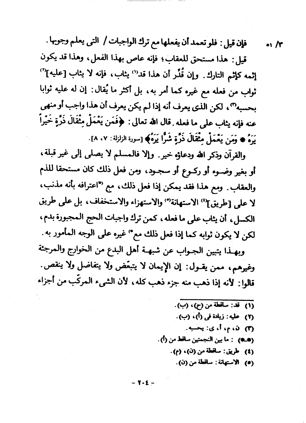 وَبِهَذَا يَتَبَيَّنُ الْجَوَابُ عَنْ شُبْهَةِ أَهْلِ الْبِدَعِ مِنَ الْخَوَارِجِ وَالْمُرْجِئَةِ وَغَيْرِهِمْ، مِمَّنْ يَقُولُ: إِنَّ الْإِيمَانَ لَا يَتَبَعَّضُ وَلَا يَتَفَاضَلُ وَلَا يَنْقُصُ. قَالُوا: لِأَنَّهُ إِذَا ذَهَبَ مِنْهُ جُزْءٌ ذَهَبَ كُلُّهُ، لِأَنَّ الشَّيْءَ الْمُرَكَّبَ مِنْ أَجْزَاءٍ