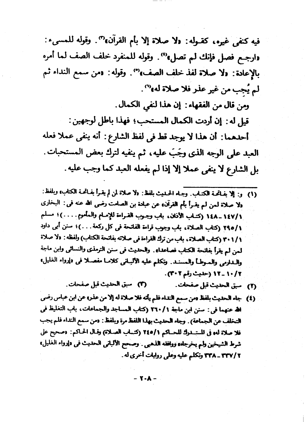 (¬4) جَاءَ الْحَدِيثُ بِلَفْظِ مَنْ سَمِعَ النِّدَاءَ فَلَمْ يَأْتِهِ فَلَا صَلَاةَ لَهُ إِلَّا مِنْ عُذْرٍ، عَنِ ابْنِ عَبَّاسٍ رَضِيَ اللَّهُ عَنْهُمَا فِي: سُنَنِ ابْنِ مَاجَهْ 1/260 كِتَابُ الْمَسَاجِدِ وَالْجَمَاعَاتِ، بَابُ التَّغْلِيظِ فِي التَّخَلُّفِ عَنِ الْجَمَاعَةِ، وَجَاءَ الْحَدِيثُ بِهَذَا اللَّفْظِ مَرَّةً وَبِلَفْظِ: مَنْ سَمِعَ النِّدَاءَ فَلَمْ يُجِبْ فَلَا صَلَاةَ لَهُ، فِي الْمُسْتَدْرَكِ لِلْحَاكِمِ 1/245 كِتَابُ الصَّلَاةِ، وَقَالَ الْحَاكِمُ: صَحِيحٌ عَلَى شَرْطِ الشَّيْخَيْنِ وَلَمْ يُخْرِجَاهُ، وَوَافَقَهُ الذَّهَبِيُّ، وَصَحَّحَ الْأَلْبَانِيُّ الْحَدِيثَ فِي إِرْوَاءِ الْغَلِيلِ 2/337 - 338 وَتَكَلَّمَ عَلَيْهِ وَعَلَى رِوَايَاتٍ أُخْرَى لَهُ.