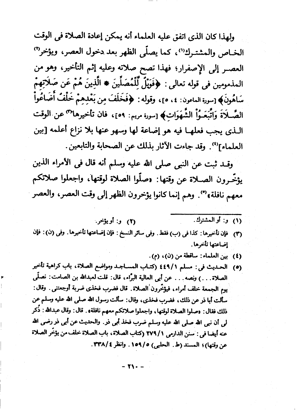 وَلِهَذَا كَانَ الَّذِي اتَّفَقَ عَلَيْهِ الْعُلَمَاءُ أَنَّهُ يُمْكِنُ إِعَادَةُ الصَّلَاةِ فِي الْوَقْتِ الْخَاصِّ وَالْمُشْتَرَكِ (¬1) ، كَمَا يُصَلِّي الظُّهْرَ بَعْدَ دُخُولِ الْعَصْرِ، وَيُؤَخِّرُ (¬2) الْعَصْرَ إِلَى الِاصْفِرَارِ ; فَهَذَا تَصِحُّ صَلَاتُهُ وَعَلَيْهِ إِثْمُ التَّأْخِيرِ، وَهُوَ مِنَ الْمَذْمُومِينَ فِي قَوْلِهِ تَعَالَى: {فَوَيْلٌ لِلْمُصَلِّينَ الَّذِينَ هُمْ عَنْ صَلَاتِهِمْ سَاهُونَ} [سُورَةُ الْمَاعُونِ: 4 - 5] وَقَوْلِهِ: {فَخَلَفَ مِنْ بَعْدِهِمْ خَلْفٌ أَضَاعُوا الصَّلَاةَ وَاتَّبَعُوا الشَّهَوَاتِ} [سُورَةُ مَرْيَمَ: 59] ، فَإِنَّ تَأْخِيرَهَا (¬3) عَنِ الْوَقْتِ الَّذِي يَجِبُ فِعْلُهَا فِيهِ هُوَ إِضَاعَةٌ لَهَا وَسَهْوٌ عَنْهَا بِلَا نِزَاعٍ أَعْلَمُهُ بَيْنَ الْعُلَمَاءِ (¬4) . وَقَدْ جَاءَتِ الْآثَارُ بِذَلِكَ عَنِ الصَّحَابَةِ وَالتَّابِعِينَ.