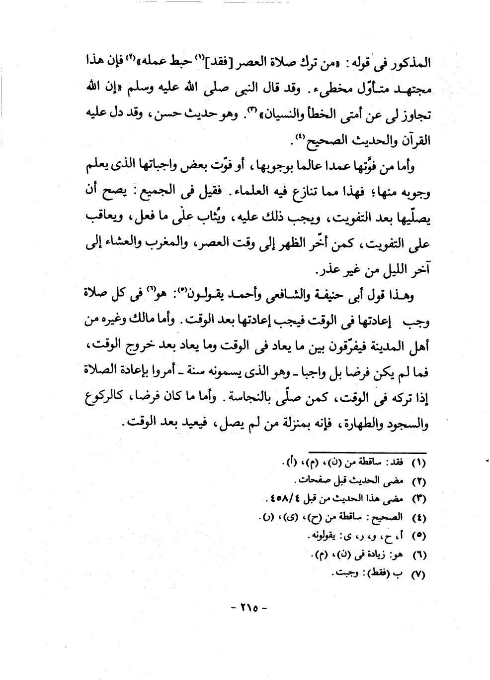 الْمَذْكُورِ فِي قَوْلِهِ: " «مَنْ تَرَكَ صَلَاةَ الْعَصْرِ فَقَدَ (¬1) حَبِطَ عَمَلُهُ» " (¬2) فَإِنَّ هَذَا مُجْتَهِدٌ مُتَأَوِّلٌ مُخْطِئٌ. وَقَدْ قَالَ النَّبِيُّ - صَلَّى اللَّهُ عَلَيْهِ وَسَلَّمَ: " «إِنَّ اللَّهَ تَجَاوَزَ لِي عَنْ أُمَّتِي الْخَطَأَ وَالنِّسْيَانَ» " (¬3) . وَهُوَ حَدِيثٌ حَسَنٌ، وَقَدْ دَلَّ عَلَيْهِ الْقُرْآنُ وَالْحَدِيثُ الصَّحِيحُ (¬4) .