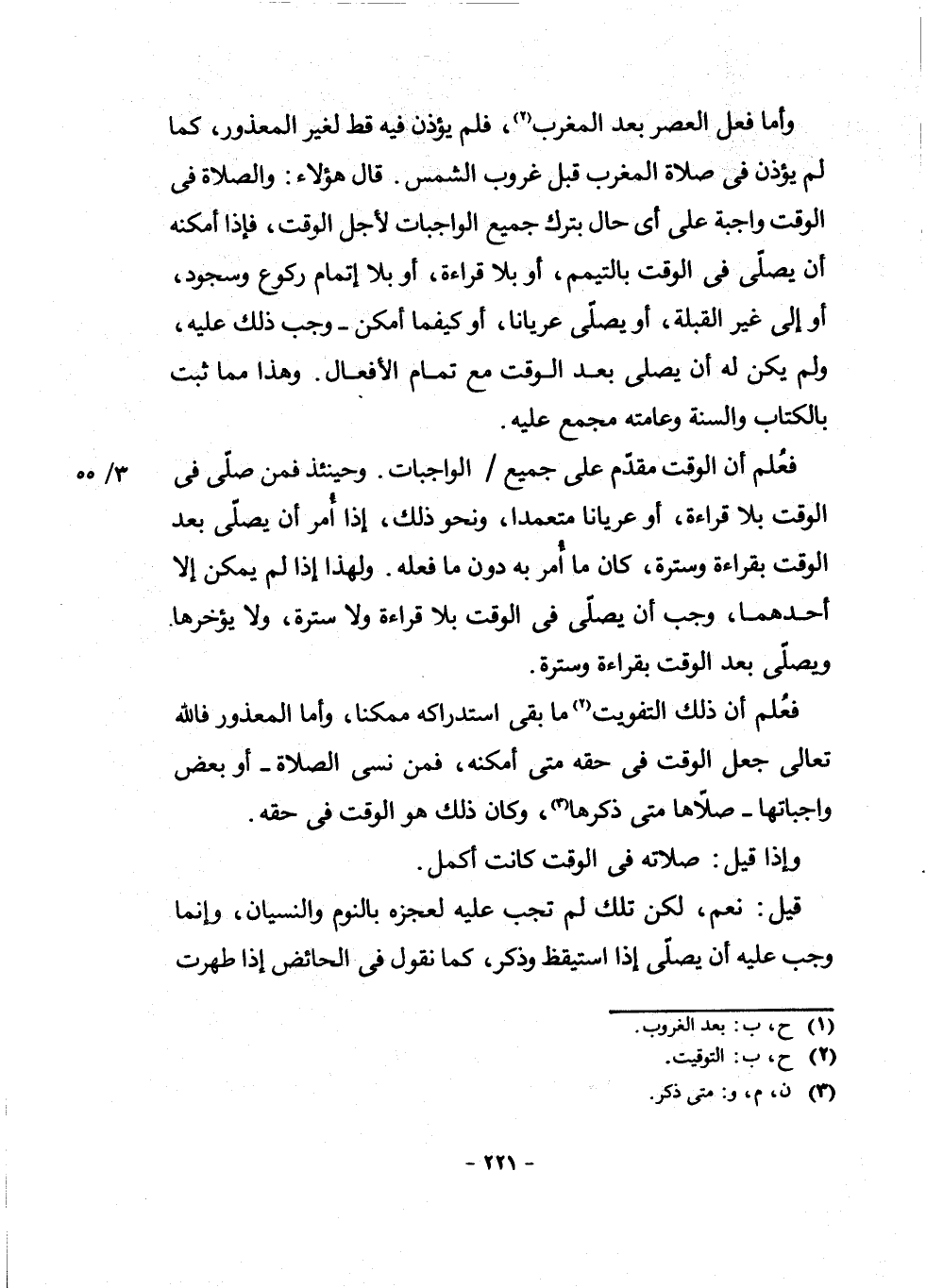 فَعُلِمَ أَنَّ ذَلِكَ التَّفْوِيتَ (¬2) مَا بَقِيَ اسْتِدْرَاكُهُ مُمْكِنًا، وَأَمَّا الْمَعْذُورُ فَاللَّهُ تَعَالَى جَعَلَ الْوَقْتَ فِي حَقِّهِ مَتَى أَمْكَنَهُ، فَمَنْ نَسِيَ الصَّلَاةَ أَوْ بَعْضَ وَاجِبَاتِهَا صَلَّاهَا مَتَى ذَكَرَهَا (¬3) ، وَكَانَ ذَلِكَ هُوَ الْوَقْتُ فِي حَقِّهِ وَإِذَا قِيلَ: صَلَاتُهُ فِي الْوَقْتِ كَانَتْ أَكْمَلَ.