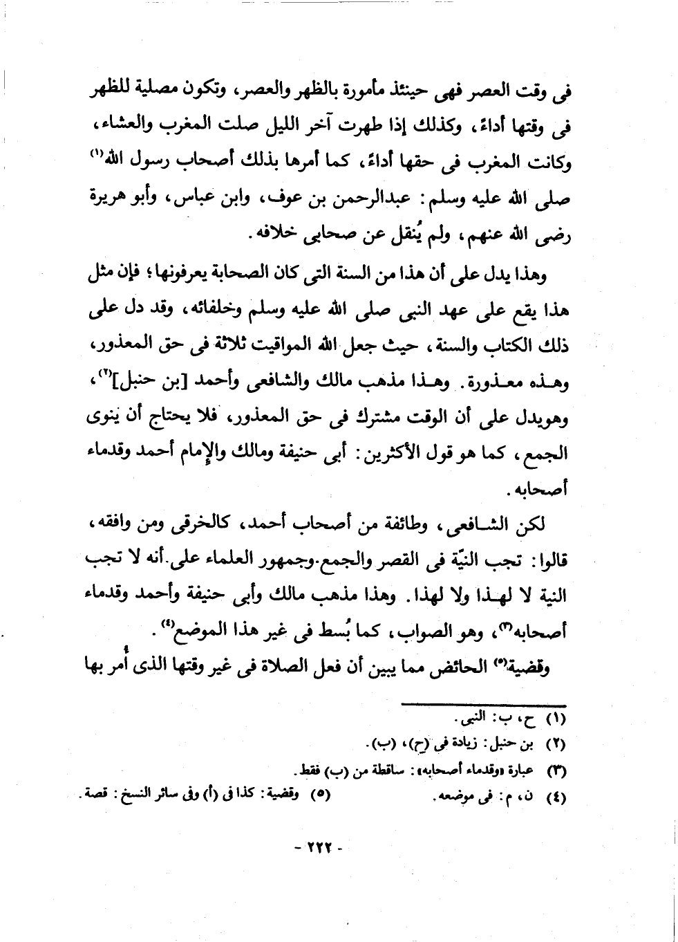 وَهَذَا يَدُلُّ عَلَى أَنَّ هَذَا مِنَ السُّنَّةِ الَّتِي كَانَ الصَّحَابَةُ يَعْرِفُونَهَا ; فَإِنَّ مِثْلَ هَذَا يَقَعُ عَلَى عَهْدِ النَّبِيِّ - صَلَّى اللَّهُ عَلَيْهِ وَسَلَّمَ - وَخُلَفَائِهِ، وَقَدْ دَلَّ عَلَى ذَلِكَ الْكِتَابُ وَالسُّنَّةُ، حَيْثُ جَعَلَ اللَّهُ الْمَوَاقِيتَ ثَلَاثَةً فِي حَقِّ الْمَعْذُورِ، وَهَذِهِ مَعْذُورَةٌ. وَهَذَا مَذْهَبُ مَالِكٍ وَالشَّافِعِيِّ " وَأَحْمَدَ بْنِ حَنْبَلٍ (¬2) ، وَهُوَ يَدُلُّ عَلَى أَنَّ الْوَقْتَ مُشْتَرَكٌ فِي حَقِّ الْمَعْذُورِ، فَلَا يَحْتَاجُ أَنْ يَنْوِيَ الْجَمْعَ، كَمَا هُوَ قَوْلُ الْأَكْثَرِينَ: أَبِي حَنِيفَةَ وَمَالِكٍ وَالْإِمَامِ أَحْمَدَ وَقُدَمَاءِ أَصْحَابِهِ.