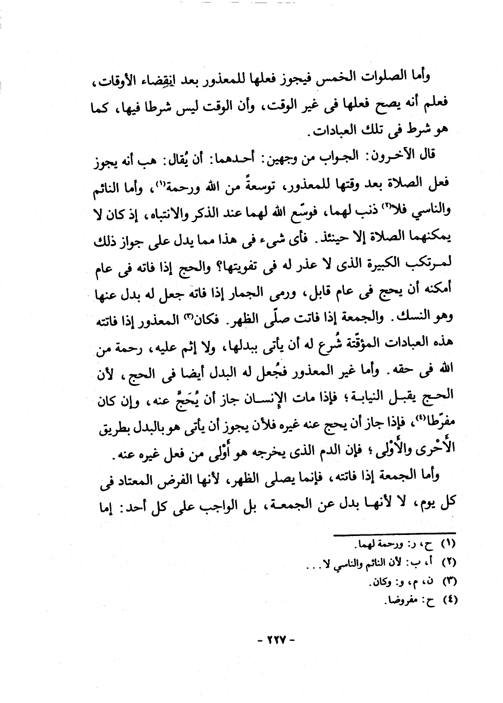 قَالَ الْآخَرُونَ: الْجَوَابُ مِنْ وَجْهَيْنِ: أَحَدُهُمَا: أَنْ يُقَالَ: هَبْ أَنَّهُ يَجُوزُ فِعْلُ الصَّلَاةِ بَعْدَ وَقْتِهَا لِلْمَعْذُورِ، تَوْسِعَةً مِنَ اللَّهِ وَرَحْمَةً (¬1) ، وَأَمَّا النَّائِمُ وَالنَّاسِي فَلَا (¬2) ذَنْبَ لَهُمَا، فَوَسَّعَ اللَّهُ لَهُمَا عِنْدَ الذِّكْرِ وَالِانْتِبَاهِ، إِذَا كَانَ لَا يُمْكِنُهُمَا الصَّلَاةُ إِلَّا حِينَئِذٍ. فَأَيُّ شَيْءٍ فِي هَذَا مِمَّا يَدُلُّ عَلَى جَوَازِ ذَلِكَ لِمُرْتَكِبِ الْكَبِيرَةِ الَّذِي لَا عُذْرَ لَهُ فِي تَفْوِيتِهَا؟ وَالْحَجُّ إِذَا فَاتَهُ فِي عَامٍ أَمْكَنَهُ أَنْ يَحُجَّ فِي عَامٍ قَابِلٍ، وَرَمْيُ الْجِمَارِ إِذَا فَاتَهُ جُعِلَ لَهُ بَدَلٌ عَنْهَا وَهُوَ النُّسُكُ. وَالْجُمُعَةُ إِذَا فَاتَتْ صَلَّى الظُّهْرَ. فَكَانَ (¬3) الْمَعْذُورُ إِذَا فَاتَتْهُ هَذِهِ الْعِبَادَاتُ الْمُؤَقَّتَةُ شَرَعَ لَهُ أَنْ يَأْتِيَ بِبَدَلِهَا، وَلَا إِثْمَ عَلَيْهِ، رَحْمَةً مِنَ اللَّهِ فِي حَقِّهِ. وَأَمَّا غَيْرُ الْمَعْذُورِ فَجُعِلَ لَهُ الْبَدَلُ أَيْضًا فِي الْحَجِّ، لِأَنَّ الْحَجَّ يَقْبَلُ النِّيَابَةَ ; فَإِذَا مَاتَ الْإِنْسَانُ جَازَ أَنْ يُحَجَّ عَنْهُ وَإِنْ كَانَ مُفْرِطًا (¬4) فَإِذَا جَازَ أَنْ يَحُجَّ عَنْهُ غَيْرُهُ فَلَأَنْ يَجُوزَ أَنْ يَأْتِيَ هُوَ بِالْبَدَلِ بِطَرِيقِ الْأَحْرَى وَالْأَوْلَى ; فَإِنَّ الدَّمَ الَّذِي يُخْرِجُهُ هُوَ أَوْلَى مِنْ فِعْلِ غَيْرِهِ عَنْهُ.