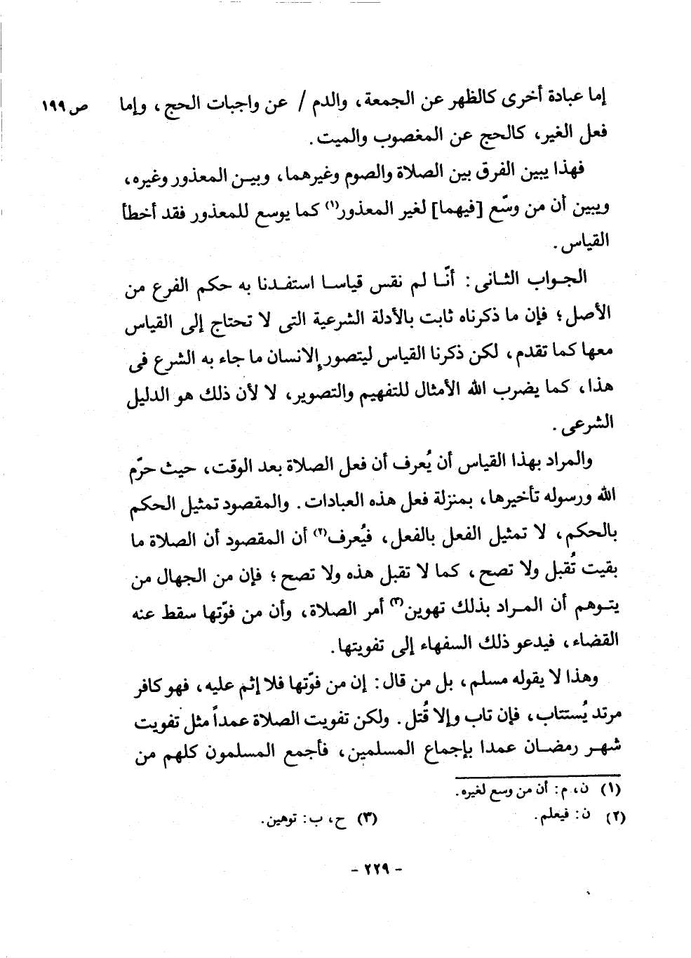 وَالْمُرَادُ بِهَذَا الْقِيَاسِ أَنْ يُعْرَفَ أَنَّ فِعْلَ الصَّلَاةِ بَعْدَ الْوَقْتِ، حَيْثُ حَرَّمَ اللَّهُ وَرَسُولُهُ تَأْخِيرَهَا، بِمَنْزِلَةِ فِعْلِ هَذِهِ الْعِبَادَاتِ. وَالْمَقْصُودُ تَمْثِيلُ الْحُكْمِ بِالْحُكْمِ، لَا تَمْثِيلُ الْفِعْلِ بِالْفِعْلِ، فَيُعْرَفُ (¬2) أَنَّ الْمَقْصُودَ أَنَّ الصَّلَاةَ مَا بَقِيَتْ تُقْبَلُ وَلَا تَصِحُّ، كَمَا لَا تُقْبَلُ هَذِهِ وَلَا تَصِحُّ ; فَإِنَّ مِنَ الْجُهَّالِ مَنْ يَتَوَهَّمُ أَنَّ الْمُرَادَ بِذَلِكَ تَهْوَيْنُ (¬3) أَمْرِ الصَّلَاةِ، وَأَنَّ مَنْ فَوَّتَهَا سَقَطَ عَنْهُ الْقَضَاءُ، فَيَدْعُو ذَلِكَ السُّفَهَاءَ إِلَى تَفْوِيتِهَا.