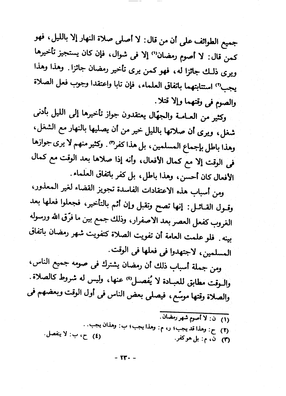 وَكَثِيرٌ مِنَ الْعَامَّةِ وَالْجُهَّالِ يَعْتَقِدُونَ جَوَازَ تَأْخِيرِهَا إِلَى اللَّيْلِ بِأَدْنَى شُغْلٍ، وَيَرَى أَنَّ صَلَاتَهَا بِاللَّيْلِ خَيْرٌ مِنْ أَنَّ يُصَلِّيَهَا بِالنَّهَارِ مَعَ الشُّغْلِ، وَهَذَا بَاطِلٌ بِإِجْمَاعِ الْمُسْلِمِينَ، بَلْ هَذَا كُفْرٌ (¬3) . وَكَثِيرٌ مِنْهُمْ لَا يَرَى جَوَازَهَا فِي الْوَقْتِ إِلَّا مَعَ كَمَالِ الْأَفْعَالِ، وَأَنَّهُ إِذَا صَلَّاهَا بَعْدَ الْوَقْتِ مَعَ كَمَالِ الْأَفْعَالِ كَانَ أَحْسَنَ، وَهَذَا بَاطِلٌ، بَلْ كُفْرٌ بِاتِّفَاقِ الْعُلَمَاءِ.