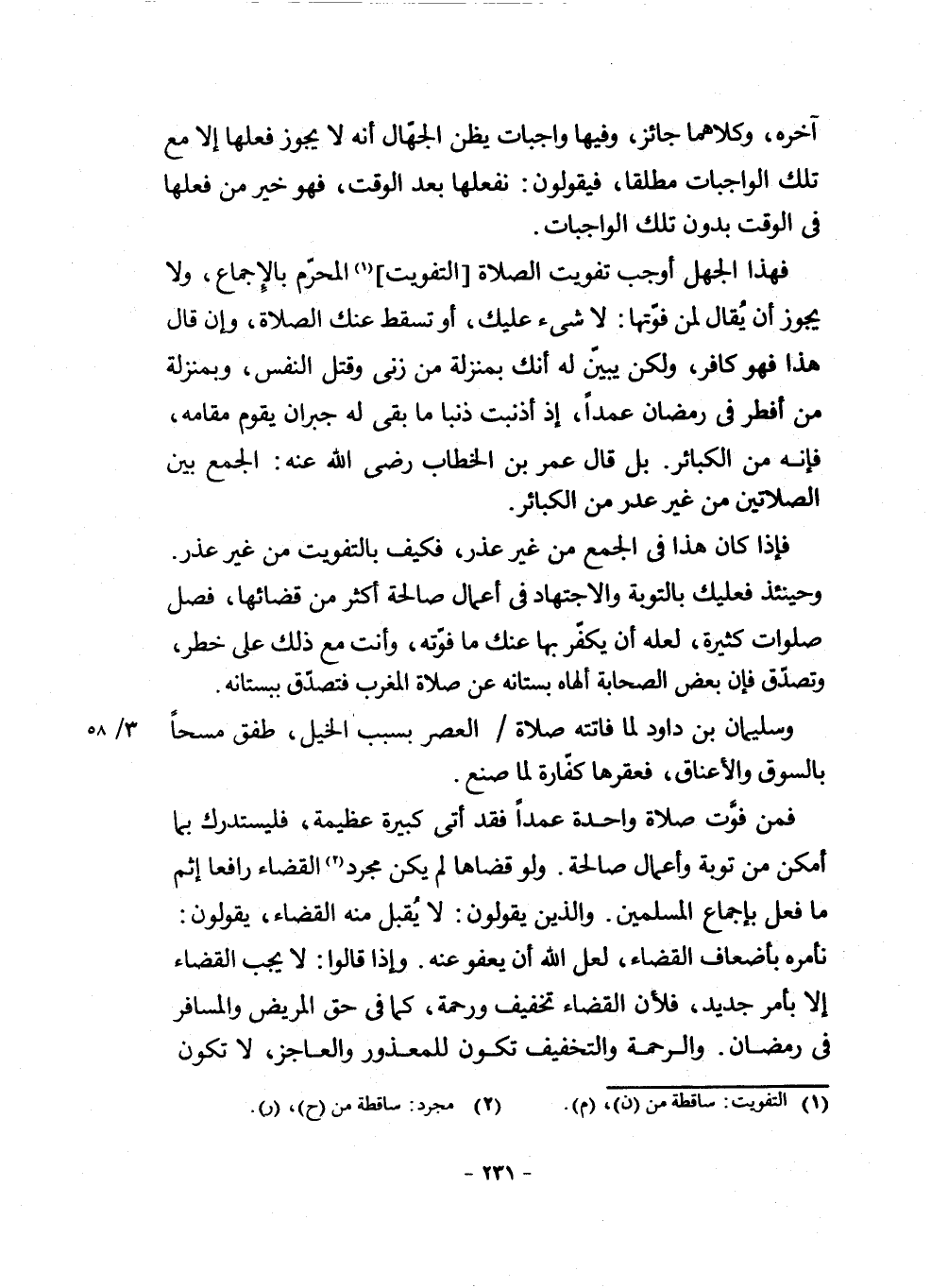 فَهَذَا الْجَهْلُ أَوْجَبَ تَفْوِيتَ الصَّلَاةِ التَّفْوِيتَ (¬1) الْمُحَرَّمَ بِالْإِجْمَاعِ، وَلَا يَجُوزُ أَنْ يُقَالَ لِمَنْ فَوَّتَهَا: لَا شَيْءَ عَلَيْكَ، أَوْ تَسْقُطُ عَنْكَ الصَّلَاةُ، وَإِنْ قَالَ هَذَا فَهُوَ كَافِرٌ، وَلَكِنْ يُبَيَّنُ لَهُ أَنَّكَ بِمَنْزِلَةٍ مَنْ زَنَى وَقَتَلَ النَّفْسَ، وَبِمَنْزِلَةِ مَنْ أَفْطَرَ رَمَضَانَ عَمْدًا، إِذْ أَذْنَبْتَ ذَنْبًا مَا بَقِيَ لَهُ جُبْرَانٌ يَقُومُ مَقَامَهُ، فَإِنَّهُ مِنَ الْكَبَائِرِ. بَلْ قَالَ عُمَرُ بْنُ الْخَطَّابِ رَضِيَ اللَّهُ عَنْهُ: الْجَمْعُ بَيْنَ الصَّلَاتَيْنِ مِنْ غَيْرِ عُذْرٍ مِنَ الْكَبَائِرِ.