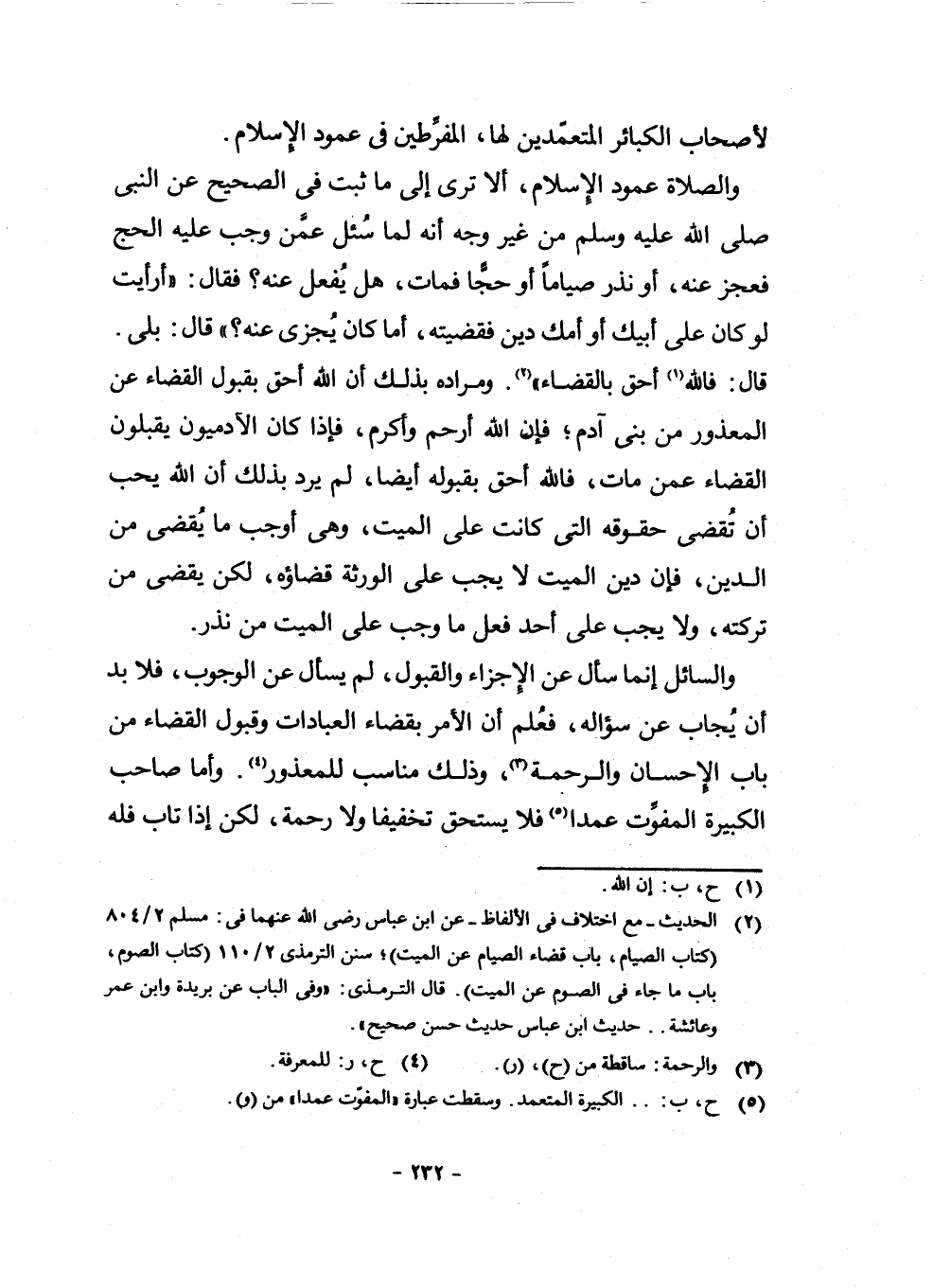 وَالصَّلَاةُ عَمُودُ الْإِسْلَامِ، أَلَا تَرَى إِلَى مَا ثَبَتَ فِي الصَّحِيحِ عَنِ النَّبِيِّ - صَلَّى اللَّهُ عَلَيْهِ وَسَلَّمَ - مِنْ غَيْرِ وَجْهٍ أَنَّهُ لَمَّا سُئِلَ عَمَّنْ وَجَبَ عَلَيْهِ الْحَجُّ فَعَجَزَ عَنْهُ، أَوْ نَذَرَ صِيَامًا أَوْ حَجًّا فَمَاتَ، هَلْ يُفْعَلُ عَنْهُ؟ فَقَالَ: " «أَرَأَيْتَ لَوْ كَانَ عَلَى أَبِيكَ أَوْ أُمِّكَ دَيْنٌ فَقَضَيْتَهُ، أَمَا كَانَ يُجْزِي عَنْهُ؟ " قَالَ: بَلَى. قَالَ: " فَاللَّهُ (¬1) أَحَقُّ بِالْقَضَاءِ» " (¬2) . وَمُرَادُهُ بِذَلِكَ أَنَّ اللَّهَ أَحَقُّ بِقَبُولِ الْقَضَاءِ عَنِ الْمَعْذُورِ مِنْ بَنِي آدَمَ ; فَإِنَّ اللَّهَ أَرْحَمُ وَأَكْرَمُ، فَإِذَا كَانَ الْآدَمِيُّونَ يَقْبَلُونَ الْقَضَاءَ عَمَّنْ مَاتَ، فَاللَّهُ أَحَقُّ بِقَبُولِهِ أَيْضًا، لَمْ يُرِدْ بِذَلِكَ أَنَّ اللَّهَ يُحِبُّ أَنْ تُقْضَى حُقُوقُهُ الَّتِي كَانَتْ عَلَى الْمَيِّتِ، وَهِيَ أَوْجَبُ مَا يُقْضَى مِنَ الدَّيْنِ، فَإِنَّ دَيْنَ الْمَيِّتِ لَا يَجِبْ عَلَى الْوَرَثَةِ قَضَاؤُهُ، لَكِنْ يُقْضَى مِنْ تَرِكَتِهِ، وَلَا يَجِبُ عَلَى أَحَدٍ فِعْلُ مَا وَجَبَ عَلَى الْمَيِّتِ مِنْ نَذْرٍ.