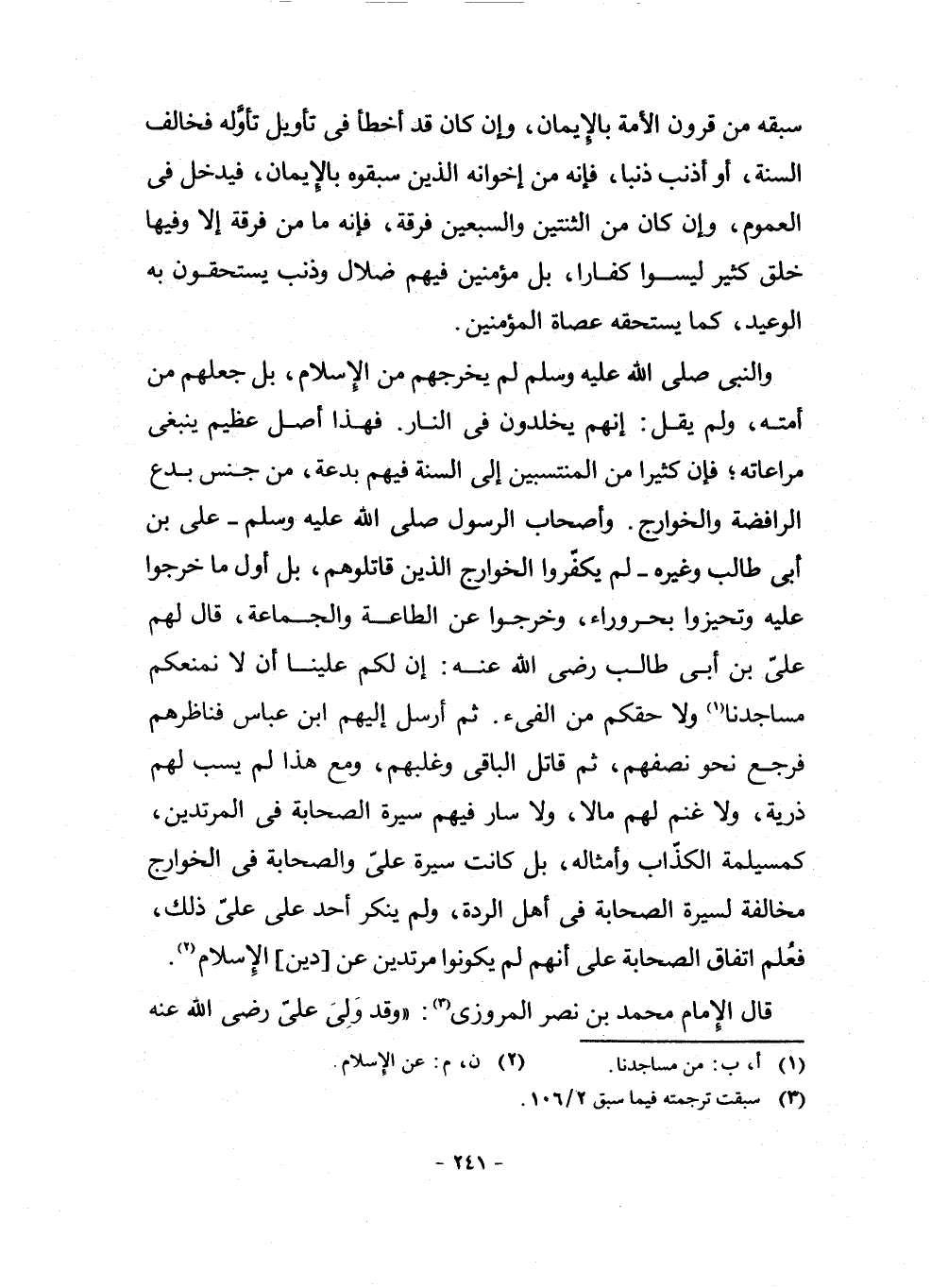 وَالنَّبِيُّ - صَلَّى اللَّهُ عَلَيْهِ وَسَلَّمَ - لَمْ يُخْرِجْهُمْ مِنَ الْإِسْلَامِ، بَلْ جَعَلَهُمْ مِنْ أُمَّتِهِ، وَلَمْ يَقُلْ: إِنَّهُمْ يَخْلُدُونَ فِي النَّارِ. فَهَذَا أَصْلٌ عَظِيمٌ يَنْبَغِي مُرَاعَاتُهُ ; فَإِنَّ كَثِيرًا مِنَ الْمُنْتَسِبِينَ إِلَى السُّنَّةِ فِيهِمْ بِدْعَةٌ، مِنْ جِنْسِ بِدَعِ الرَّافِضَةِ وَالْخَوَارِجِ. وَأَصْحَابُ الرَّسُولِ - صَلَّى اللَّهُ عَلَيْهِ وَسَلَّمَ - عَلِيُّ بْنُ أَبِي طَالِبٍ وَغَيْرُهُ لَمْ يُكَفِّرُوا الْخَوَارِجَ الَّذِينَ قَاتَلُوهُمْ، بَلْ أَوَّلُ مَا خَرَجُوا عَلَيْهِ وَتَحَيَّزُوا بِحَرُورَاءَ، وَخَرَجُوا عَنِ الطَّاعَةِ وَالْجَمَاعَةِ، قَالَ لَهُمْ عَلِيُّ بْنُ أَبِي طَالِبٍ رَضِيَ اللَّهُ عَنْهُ: إِنَّ لَكُمْ عَلَيْنَا أَنْ لَا نَمْنَعَكُمْ مَسَاجِدَنَا (¬1) وَلَا حَقَّكُمْ مِنَ الْفَيْءِ. ثُمَّ أَرْسَلَ إِلَيْهِمُ ابْنَ عَبَّاسٍ فَنَاظَرَهُمْ فَرَجَعَ نَحْوُ نِصْفِهِمْ، ثُمَّ قَاتَلَ الْبَاقِيَ وَغَلَبَهُمْ، وَمَعَ هَذَا لَمْ يَسْبِ لَهُمْ ذُرِّيَّةً، وَلَا غَنِمَ لَهُمْ مَالًا، وَلَا سَارَ فِيهِمْ سِيرَةَ الصَّحَابَةِ فِي الْمُرْتَدِّينَ، كَمُسَيْلِمَةَ الْكَذَّابِ وَأَمْثَالِهِ، بَلْ كَانَتْ سِيرَةُ عَلِيٍّ وَالصَّحَابَةِ فِي الْخَوَارِجِ مُخَالِفَةً لِسِيرَةِ الصَّحَابَةِ فِي أَهْلِ الرِّدَّةِ، وَلَمْ يُنْكِرْ أَحَدٌ عَلَى عَلِيٍّ ذَلِكَ، فَعُلِمَ اتِّفَاقُ الصَّحَابَةِ عَلَى أَنَّهُمْ لَمْ يَكُونُوا مُرْتَدِّينَ عَنْ دِينِ الْإِسْلَامِ (¬2) .