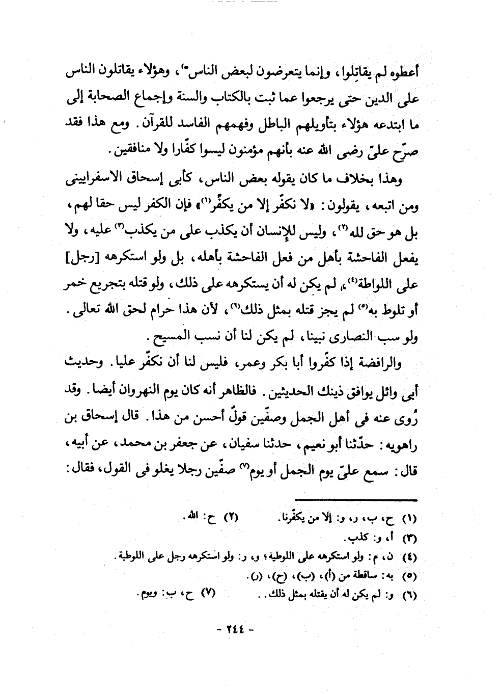 وَالرَّافِضَةُ إِذَا كَفَّرُوا أَبَا بَكْرٍ وَعُمَرَ، فَلَيْسَ لَنَا أَنْ نُكَفِّرَ عَلِيًّا. وَحَدِيثُ أَبِي وَائِلٍ يُوَافِقُ ذَيْنَكَ الْحَدِيثَيْنِ. فَالظَّاهِرُ أَنَّهُ كَانَ يَوْمُ النَّهْرَوَانِ أَيْضًا. وَقَدْ رُوِيَ عَنْهُ فِي أَهْلِ الْجَمَلِ وَصِفِّينَ قَوْلٌ أَحْسَنُ مِنْ هَذَا. قَالَ إِسْحَاقُ بْنُ رَاهَوَيْهِ: حَدَّثَنَا أَبُو نُعَيْمٍ، حَدَّثَنَا سُفْيَانُ، عَنْ جَعْفَرِ بْنِ مُحَمَّدٍ، عَنْ أَبِيهِ، قَالَ: سَمِعَ عَلِيًّ يَوْمَ الْجَمَلِ أَوْ يَوْمَ (¬8) صِفِّينَ رَجُلًا يَغْلُو فِي الْقَوْلِ، فَقَالَ: