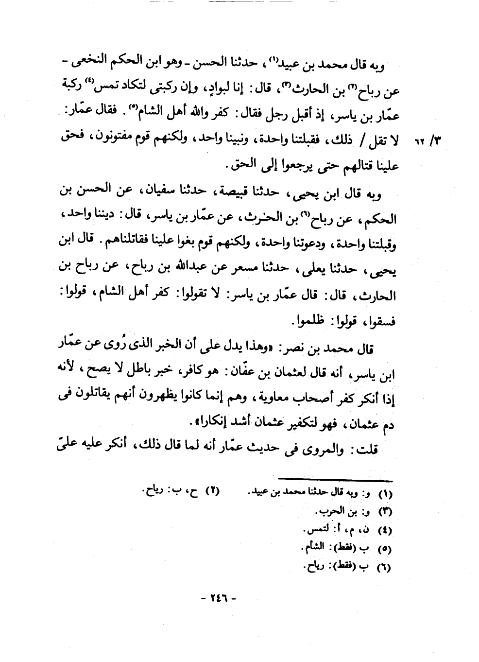 وَبِهِ قَالَ ابْنُ يَحْيَى، حَدَّثَنَا قَبِيصَةُ، حَدَّثَنَا سُفْيَانُ، عَنِ الْحَسَنِ بْنِ الْحَكَمِ، عَنْ رَبَاحِ (¬6) بْنِ الْحَارِثِ، عَنْ عَمَّارِ بْنِ يَاسِرٍ، قَالَ: دِينُنَا وَاحِدٌ، وَقِبْلَتُنَا وَاحِدَةٌ، وَدَعْوَتُنَا وَاحِدَةٌ، وَلَكِنَّهُمْ قَوْمٌ بَغَوْا عَلَيْنَا فَقَاتَلْنَاهُمْ. قَالَ ابْنُ يَحْيَى: حَدَّثَنَا يَعْلَى، حَدَّثَنَا مِسْعَرُ عَنْ عَبْدِ اللَّهِ بْنِ رَبَاحٍ، عَنْ رَبَاحِ بْنِ الْحَارِثِ، قَالَ: قَالَ عَمَّارُ بْنُ يَاسِرٍ: لَا تَقُولُوا كَفَرَ أَهْلُ الشَّامِ، قُولُوا: فَسَقُوا، قُولُوا: ظَلَمُوا.