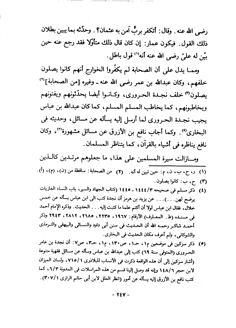 وَمِمَّا يَدُلُّ عَلَى أَنَّ الصَّحَابَةَ لَمْ يُكَفِّرُوا الْخَوَارِجَ أَنَّهُمْ كَانُوا يُصَلُّونَ خَلْفَهُمْ، وَكَانَ عَبْدُ اللَّهِ بْنُ عُمَرَ رَضِيَ اللَّهُ عَنْهُ وَغَيْرُهُ مِنَ الصَّحَابَةِ (¬2) يُصَلُّونَ (¬3) خَلَفَ نَجْدَةَ الْحَرُورِيِّ، وَكَانُوا أَيْضًا يُحَدِّثُونَهُمْ وَيُفْتُونَهُمْ وَيُخَاطِبُونَهُمْ، كَمَا يُخَاطِبُ الْمُسْلِمُ الْمُسْلِمَ، كَمَا كَانَ عَبْدُ اللَّهِ بْنُ عَبَّاسٍ يُجِيبُ نَجْدَةَ الْحَرُورِيَّ لَمَّا أَرْسَلَ إِلَيْهِ يَسْأَلُهُ عَنْ مَسَائِلَ، وَحَدِيثُهُ فِي الْبُخَارِيِّ (¬4) . وَكَمَا أَجَابَ نَافِعُ بْنُ الْأَزْرَقِ عَنْ مَسَائِلَ مَشْهُورَةٍ (¬5) ، وَكَانَ نَافِعٌ يُنَاظِرُهُ فِي أَشْيَاءَ بِالْقُرْآنِ، كَمَا يَتَنَاظَرُ الْمُسْلِمَانِ.