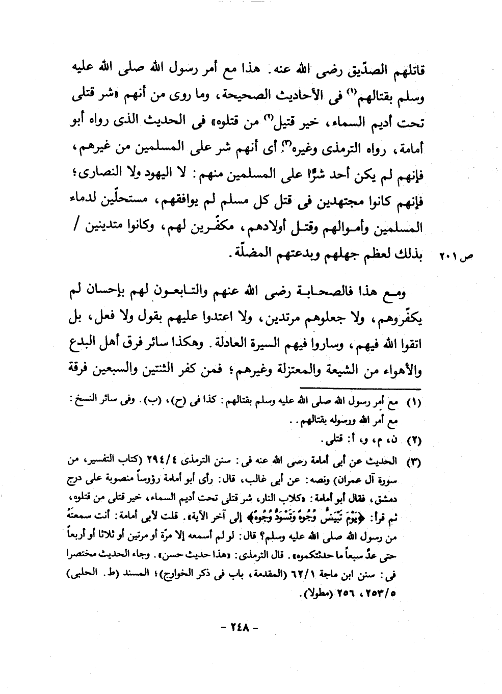(¬3) الْحَدِيثُ عَنْ أَبِي أُمَامَةَ رَضِيَ اللَّهُ عَنْهُ فِي: سُنَنِ التِّرْمِذِيِّ 4/294 كِتَابُ التَّفْسِيرِ مِنْ سُورَةِ آلِ عِمْرَانَ، وَنَصُّهُ: عَنْ أَبِي غَالِبٍ، قَالَ: رَأَى أَبُو أُمَامَةَ رُءُوسًا مَنْصُوبَةً عَلَى دَرَجِ دِمَشْقَ فَقَالَ أَبُو أُمَامَةَ: كِلَابُ النَّارِ، شَرُّ قَتْلَى تَحْتَ أَدِيمِ السَّمَاءِ، خَيْرُ قَتْلَى مَنْ قَتَلُوهُ، ثُمَّ قَرَأَ (يَوْمَ تَبْيَضُّ وُجُوهٌ وَتَسْوَدُّ وُجُوهٌ) إِلَى آخَرَ الْآيَةِ. قُلْتُ لِأَبِي أُمَامَةَ: أَنْتِ سَمِعْتَهُ مِنْ رَسُولِ اللَّهِ صَلَّى اللَّهُ عَلَيْهِ وَسَلَّمَ؟ قَالَ: لَوْ لَمْ أَسْمَعْهُ إِلَّا مَرَّةً أَوْ مَرَّتَيْنِ أَوْ ثَلَاثًا أَوْ أَرْبَعًا حَتَّى عَدَّ سَبْعًا مَا حَدَّثْتُكُمُوهُ، قَالَ التِّرْمِذِيُّ: هَذَا حَدِيثٌ حَسَنٌ، وَجَاءَ الْحَدِيثُ مُخْتَصَرًا فِي: سُنَنِ ابْنِ مَاجَهْ 1/62 الْمُقَدِّمَةُ، بَابٌ فِي ذِكْرِ الْخَوَارِجِ الْمُسْنِدَ ط. الْحَلَبِيِّ 5/253، 256 مُطَوَّلًا.