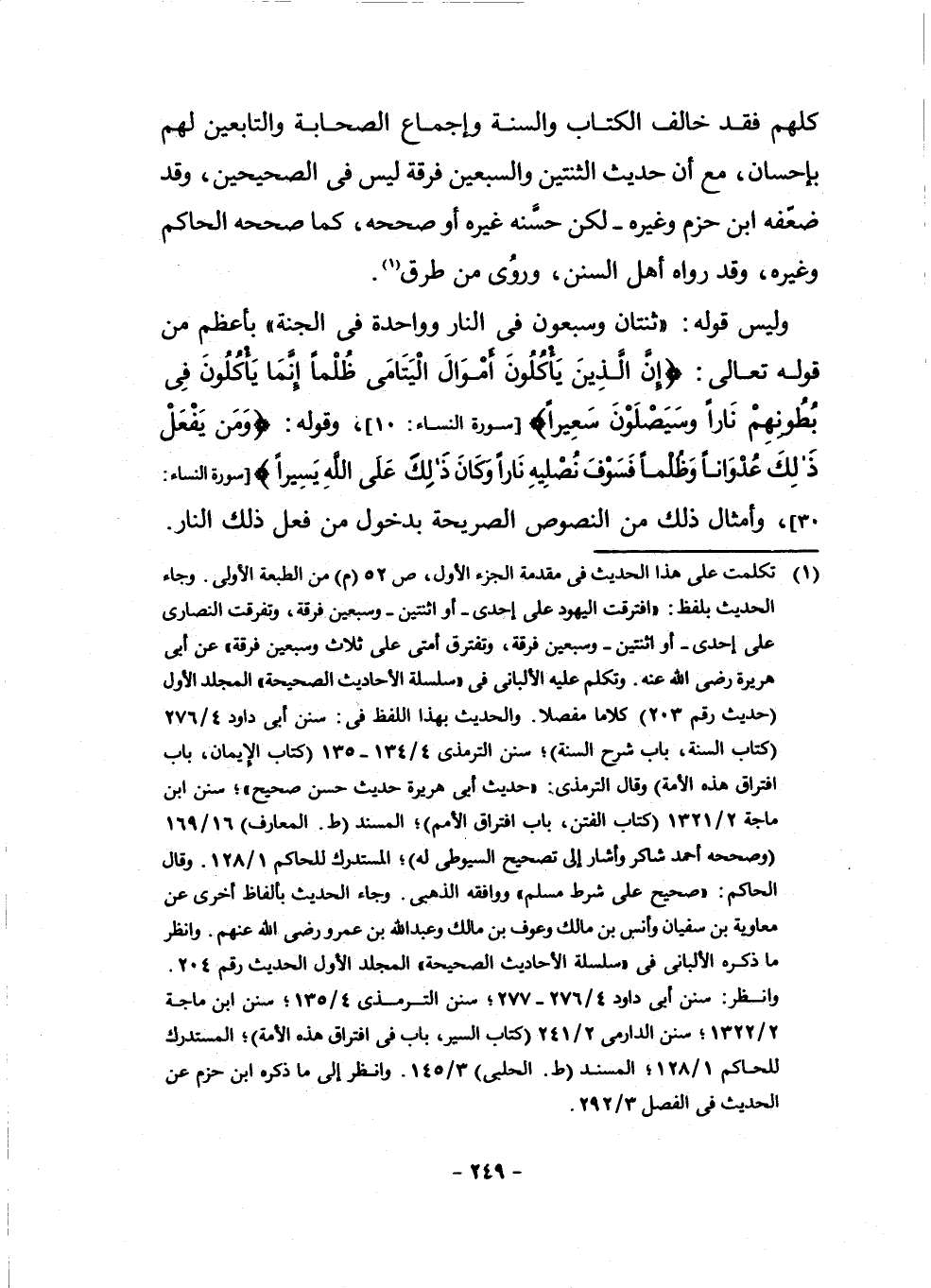(¬1) تَكَلَّمْتُ عَلَى هَذَا الْحَدِيثِ فِي مُقَدِّمَةِ الْجُزْءِ الْأَوَّلِ ص [0 - 9] 2 مِنَ الطَّبْعَةِ الْأَوْلَى، وَجَاءَ الْحَدِيثُ بِلَفْظِ: افْتَرَقَتِ الْيَهُودُ عَلَى إِحْدَى أَوِ اثْنَتَيْنِ وَسَبْعِينَ فِرْقَةً، وَتَفَرَّقَتِ النَّصَارَى عَلَى إِحْدَى أَوِ اثْنَتَيْنِ وَسَبْعِينَ فِرْقَةً، وَتَفْتَرِقُ أُمَّتِي عَلَى ثَلَاثٍ وَسَبْعِينَ فِرْقَةً، عَنْ أَبِي هُرَيْرَةَ رَضِيَ اللَّهُ عَنْهُ، وَتَكَلَّمَ عَلَيْهِ الْأَلْبَانِيُّ فِي سِلْسِلَةِ الْأَحَادِيثِ الصَّحِيحَةِ الْمُجَلَّدِ الْأَوَّلِ حَدِيثٍ رَقْمِ 203 كَلَامًا مُفَصَّلًا، وَالْحَدِيثُ بِهَذَا اللَّفْظِ فِي سُنَنِ أَبِي دَاوُدَ 4/276 كِتَابُ السُّنَّةِ، بَابُ شَرْحِ السُّنَّةِ، سُنَنَ التِّرْمِذِيِّ 4/134 - 135 كِتَابُ الْإِيمَانِ، بَابُ افْتِرَاقِ هَذِهِ الْأُمَّةِ، وَقَالَ التِّرْمِذِيُّ: حَدِيثُ أَبِي هُرَيْرَةَ حَدِيثٌ حَسَنٌ صَحِيحٌ، سُنَنَ ابْنِ مَاجَهْ 2/1321 كِتَابُ الْفِتَنِ، بَابُ افْتِرَاقِ الْأُمَمِ، الْمُسْنَدَ ط. الْمَعَارِفِ 16/169 وَصَحَّحَهُ أَحْمَدُ شَاكِر وَأَشَارَ إِلَى تَصْحِيحِ السُّيُوطِيِّ لَهُ، الْمُسْتَدْرَكِ لِلْحَاكِمِ 1/128 وَقَالَ الْحَاكِمُ: صَحِيحٌ عَلَى شَرْطِ مُسْلِمٍ، وَوَافَقَهُ الذَّهَبِيُّ، وَجَاءَ الْحَدِيثُ بِأَلْفَاظٍ أُخْرَى عَنْ مُعَاوِيَةَ بْنِ أَبِي سُفْيَانَ وَأَنَسِ بْنِ مَالِكٍ وَعَوْفِ بْنِ مَالِكٍ وَعَبْدِ اللَّهِ بْنِ عَمْرٍو رَضِيَ اللَّهُ عَنْهُمْ، وَانْظُرْ مَا ذَكَرَهُ الْأَلْبَانِيُّ فِي سِلْسِلَةِ الْأَحَادِيثِ الصَّحِيحَةِ الْمُجَلَّدِ الْأَوَّلِ الْحَدِيثِ رَقْمِ 204 وَانْظُرْ: سُنَنَ أَبِي دَاوُدَ 4/276 - 277 سُنَنَ التِّرْمِذِيِّ 4/135، سُنَنَ ابْنِ مَاجَهْ 2/1322 سُنَنَ الدَّارِمِيِّ 2/241، كِتَابُ السِّيَرِ، بَابٌ فِي افْتِرَاقِ هَذِهِ الْأُمَّةِ، الْمُسْتَدْرَكَ، لِلْحَاكِمِ 1/128 الْمَسْنَدَ ط. الْحَلَبِيِّ 3/145، وَانْظُرْ إِلَى مَا ذَكَرَهُ ابْنُ حَزْمٍ عَنِ الْحَدِيثِ فِي الْفِصَلِ 3/292