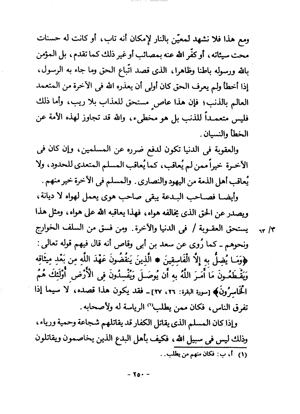 وَأَيْضًا فَصَاحِبُ الْبِدْعَةِ يَبْقَى صَاحِبُ هَوًى يَعْمَلُ لِهَوَاهِ لَا دِيَانَةً، وَيَصْدُرُ عَنِ الْحَقِّ الَّذِي يُخَالِفُهُ هَوَاهُ، فَهَذَا يُعَاقِبُهُ اللَّهُ عَلَى هَوَاهُ، وَمِثْلُ هَذَا يَسْتَحِقُّ الْعُقُوبَةَ فِي الدُّنْيَا وَالْآخِرَةِ. وَمَنْ فَسَقَ مِنَ السَّلَفِ الْخَوَارِجِ وَنَحْوَهُمْ كَمَا رُوِيَ عَنْ سَعْدِ بْنِ أَبِي وَقَّاصٍ أَنَّهُ قَالَ فِيهِمْ قَوْلَهُ تَعَالَى: {وَمَا يُضِلُّ بِهِ إِلَّا الْفَاسِقِينَ - الَّذِينَ يَنْقُضُونَ عَهْدَ اللَّهِ مِنْ بَعْدِ مِيثَاقِهِ وَيَقْطَعُونَ مَا أَمَرَ اللَّهُ بِهِ أَنْ يُوصَلَ وَيُفْسِدُونَ فِي الْأَرْضِ أُولَئِكَ هُمُ الْخَاسِرُونَ} [سُورَةُ الْبَقَرَةِ: 26 - 27] فَقَدْ يَكُونُ هَذَا قَصَدَهُ، لَا سِيَّمَا إِذَا تَفَرَّقَ النَّاسُ، فَكَانَ مِمَّنْ يَطْلُبُ (¬1) الرِّيَاسَةَ لَهُ وَلِأَصْحَابِهِ.