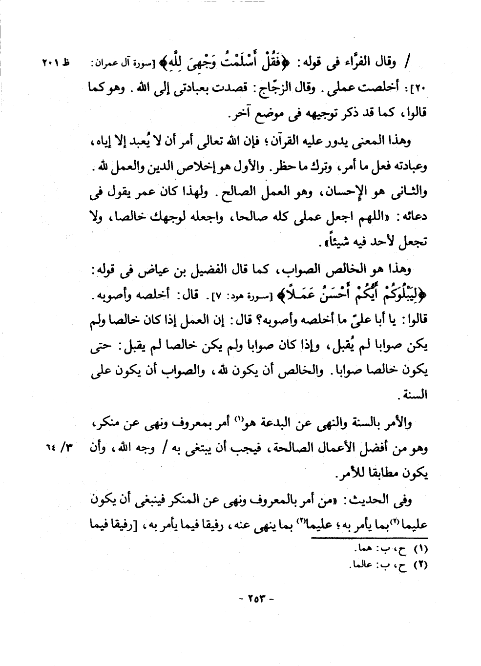 وَهَذَا الْمَعْنَى يَدُورُ عَلَيْهِ الْقُرْآنُ ; فَإِنَّ اللَّهَ تَعَالَى أَمَرَ أَنْ لَا يُعْبَدَ إِلَّا إِيَّاهُ، وَعِبَادَتُهُ فِعْلُ مَا أَمَرَ، وَتَرْكُ مَا حَظَرَ. وَالْأَوَّلُ هُوَ إِخْلَاصُ الدِّينِ وَالْعَمَلُ لِلَّهِ. وَالثَّانِي هُوَ الْإِحْسَانُ، وَهُوَ الْعَمَلُ الصَّالِحُ. وَلِهَذَا كَانَ عُمَرُ يَقُولُ فِي دُعَائِهِ: " اللَّهُمَّ اجْعَلْ عَمَلِي كُلَّهُ صَالِحًا، وَاجْعَلْهُ لِوَجْهِكَ خَالِصًا، وَلَا تَجْعَلْ لِأَحَدٍ فِيهِ شَيْئًا ".