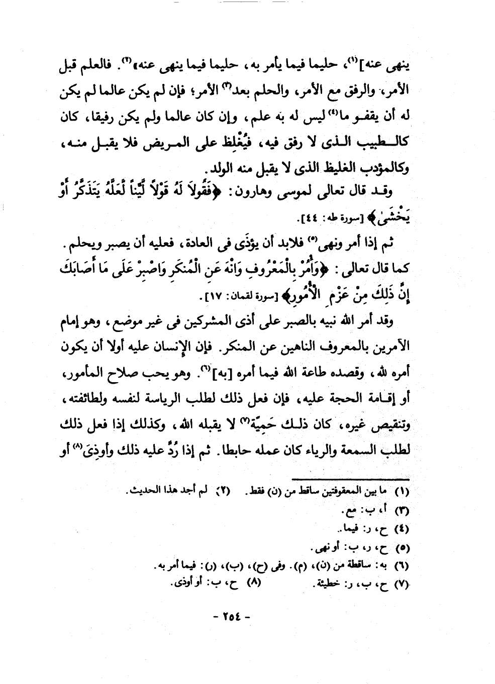 وَقَدْ أَمَرَ اللَّهُ نَبِيَهُ بِالصَّبْرِ عَلَى أَذَى الْمُشْرِكِينَ فِي غَيْرِ مَوْضِعٍ، وَهُوَ إِمَامُ الْآمِرِينَ بِالْمَعْرُوفِ النَّاهِينَ عَنِ الْمُنْكَرِ. فَإِنَّ الْإِنْسَانَ عَلَيْهِ أَوَّلًا أَنْ يَكُونَ أَمْرُهُ لِلَّهِ، وَقَصْدُهُ طَاعَةَ اللَّهِ فِيمَا أَمَرَهُ بِهِ (¬6) . وَهُوَ يُحِبُّ صَلَاحَ الْمَأْمُورِ، أَوْ إِقَامَةَ الْحُجَّةِ عَلَيْهِ فَإِنْ فَعَلَ ذَلِكَ لِطَلَبِ الرِّيَاسَةِ لِنَفْسِهِ وَلِطَائِفَتِهِ، وَتَنْقِيصِ غَيْرِهِ كَانَ ذَلِكَ حَمِيَّةً (¬7) لَا يَقْبَلُهُ اللَّهُ، وَكَذَلِكَ إِذَا فَعَلَ ذَلِكَ لِطَلَبِ السُّمْعَةِ وَالرِّيَاءِ كَانَ عَمَلُهُ حَابِطًا. ثُمَّ إِذَا رَدَّ عَلَيْهِ ذَلِكَ وَأُوذِيَ (¬8) أَوْ