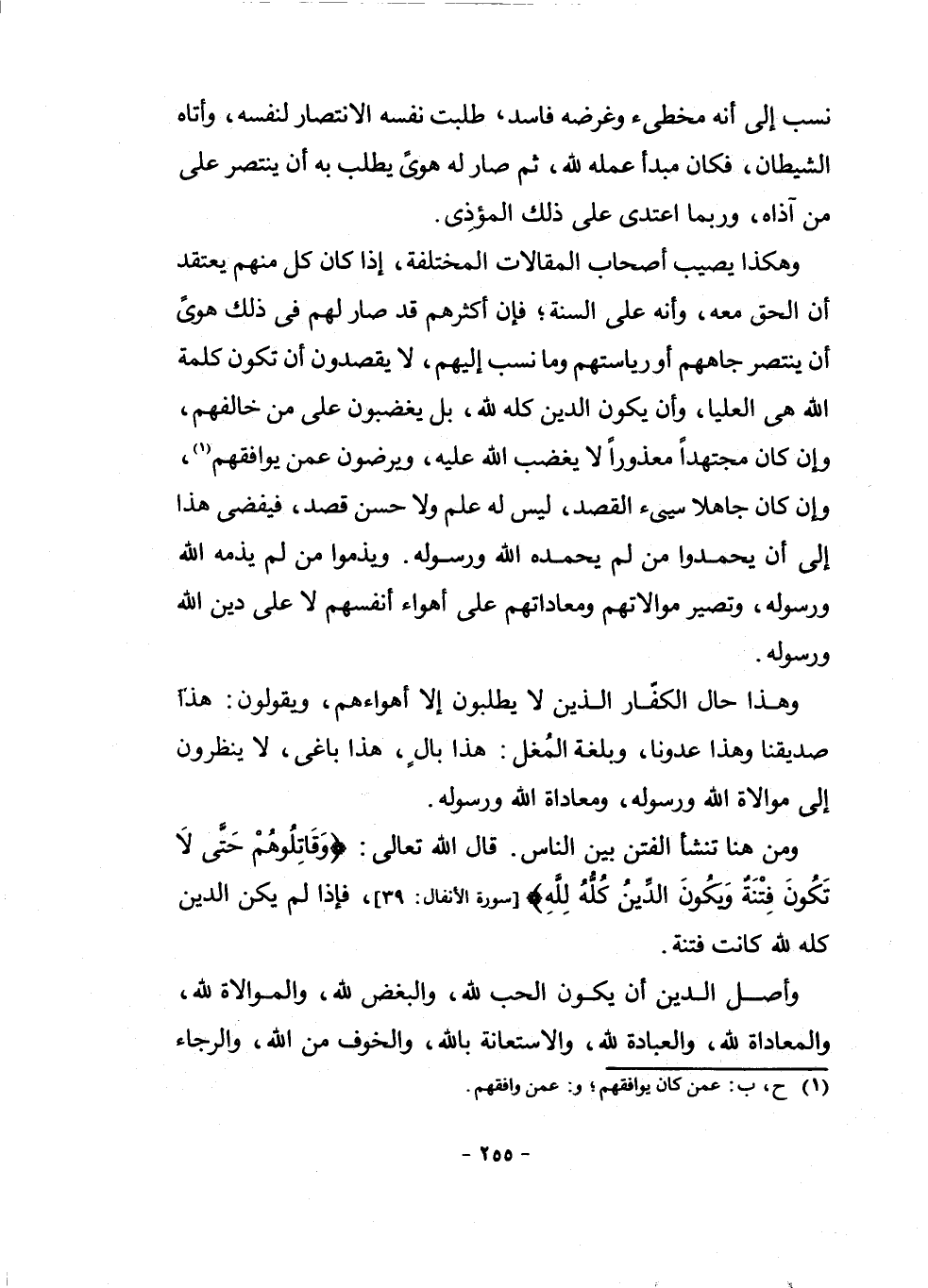وَأَصْلُ الدِّينِ أَنْ يَكُونَ الْحُبُّ لِلَّهِ، وَالْبُغْضُ لِلَّهِ، وَالْمُوَالَاةُ لِلَّهِ، وَالْمُعَادَاةُ لِلَّهِ، وَالْعِبَادَةُ لِلَّهِ، وَالِاسْتِعَانَةُ بِاللَّهِ، وَالْخَوْفُ مِنَ اللَّهِ، وَالرَّجَاءُ