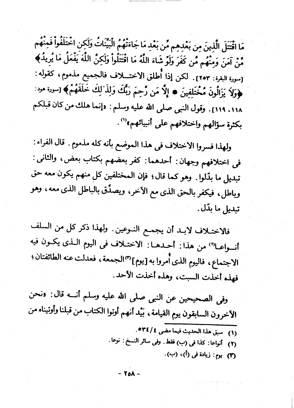 [سُورَةُ الْبَقَرَةِ: 253] . لَكِنْ إِذَا أُطْلِقَ الِاخْتِلَافُ فَالْجَمِيعُ مَذْمُومٌ كَقَوْلِهِ: {وَلَا يَزَالُونَ مُخْتَلِفِينَ - إِلَّا مَنْ رَحِمَ رَبُّكَ وَلِذَلِكَ} خَلَقَهُمْ [سُورَةُ هُودٍ: 118 - 119] . وَقَوْلِ النَّبِيِّ - صَلَّى اللَّهُ عَلَيْهِ وَسَلَّمَ: " «إِنَّمَا هَلَكَ مَنْ كَانَ قَبْلكُمْ بِكَثْرَةِ سُؤَالِهِمْ وَاخْتِلَافِهِمْ عَلَى أَنْبِيَائِهِمْ» ". (¬1)