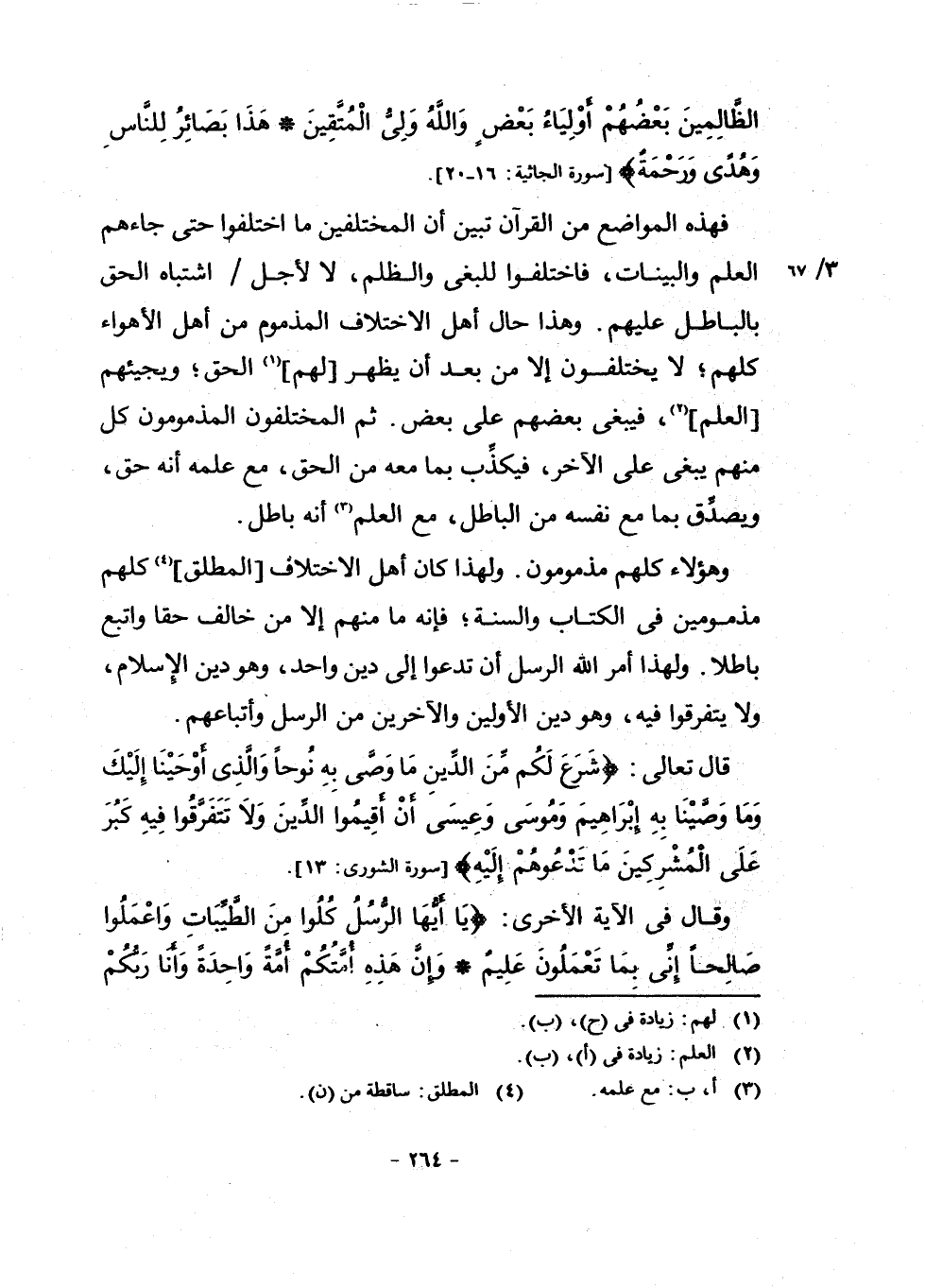 فَهَذِهِ الْمَوَاضِعُ مِنَ الْقُرْآنِ تُبَيِّنُ أَنَّ الْمُخْتَلِفِينَ مَا اخْتَلَفُوا حَتَّى جَاءَهُمُ الْعِلْمُ وَالْبَيِّنَاتُ، فَاخْتَلَفُوا لِلْبَغْيِ وَالظُّلْمِ، لَا لِأَجْلِ اشْتِبَاهِ الْحَقِّ بِالْبَاطِلِ عَلَيْهِمْ. وَهَذَا حَالُ أَهْلِ الِاخْتِلَافِ الْمَذْمُومِ مَنْ أَهْلِ الْأَهْوَاءِ كُلِّهِمْ ; لَا يَخْتَلِفُونَ إِلَّا مِنْ بَعْدِ أَنْ يَظْهَرَ لَهُمُ (¬1) الْحَقُّ ; وَيَجِيئَهُمُ، الْعِلْمُ (¬2) فَيَبْغِي بَعْضُهُمْ عَلَى بَعْضٍ. ثُمَّ الْمُخْتَلِفُونَ الْمَذْمُومُونَ كُلٌّ مِنْهُمْ يَبْغِي عَلَى الْآخَرِ، فَيُكَذِّبُ بِمَا مَعَهُ مِنَ الْحَقِّ، مَعَ عِلْمِهِ أَنَّهُ حَقٌّ، وَيُصَدِّقُ بِمَا مَعَ نَفْسِهِ مِنَ الْبَاطِلِ، مَعَ الْعِلْمِ (¬3) أَنَّهُ بَاطِلٌ.