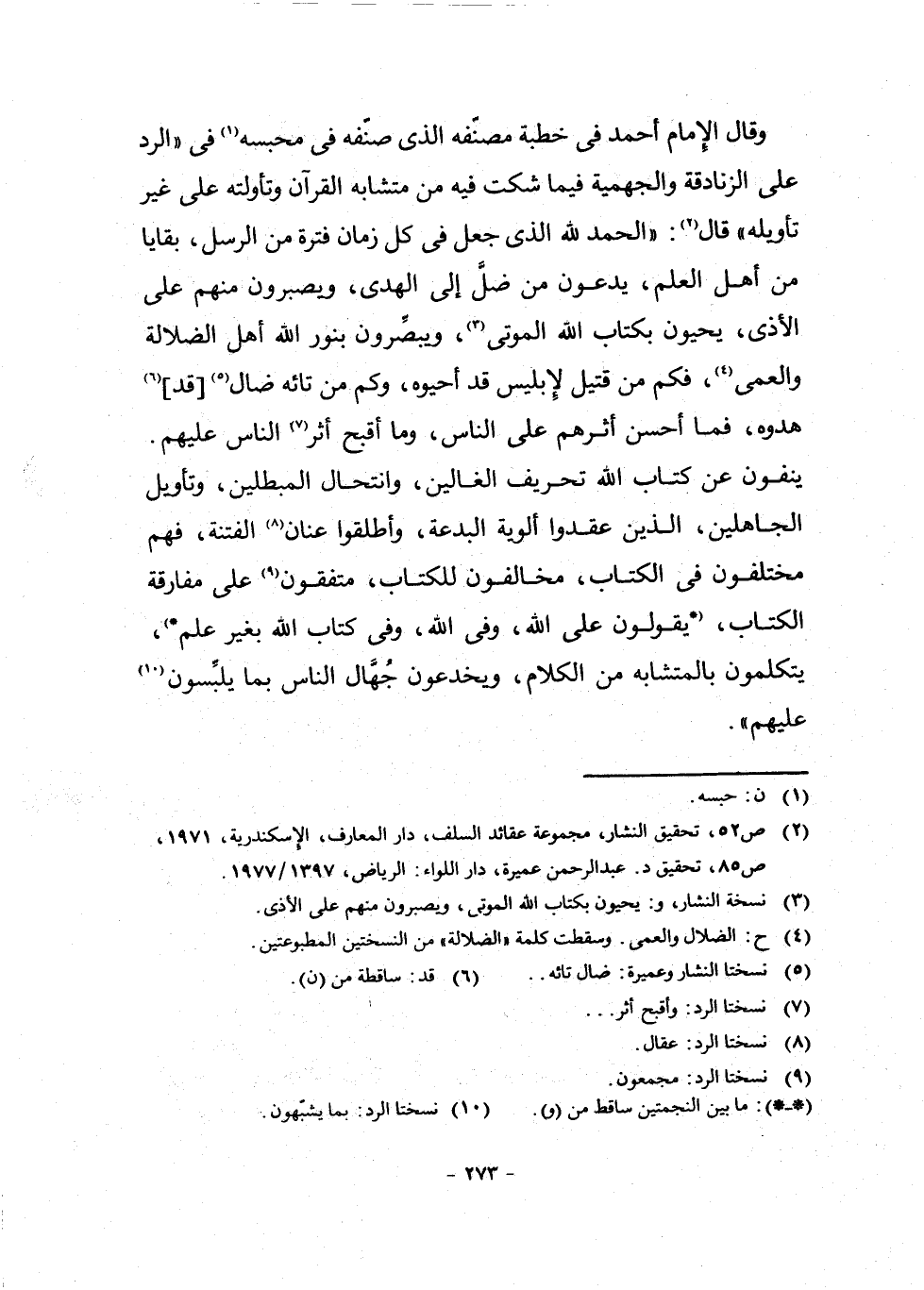 (¬2) ص [0 - 9] 2 تَحْقِيقُ النَّشَّارِ، مَجْمُوعَةُ عَقَائِدِ السَّلَفِ، دَارُ الْمَعَارِفِ، الْإِسْكَنْدَرِيَّةُ، 1971، ص 85، تَحْقِيقُ د. عَبْدِ الرَّحْمَنْ عَمِيرَةْ، دَارُ اللِّوَاءِ الرِّيَاضُ 1397/1977.