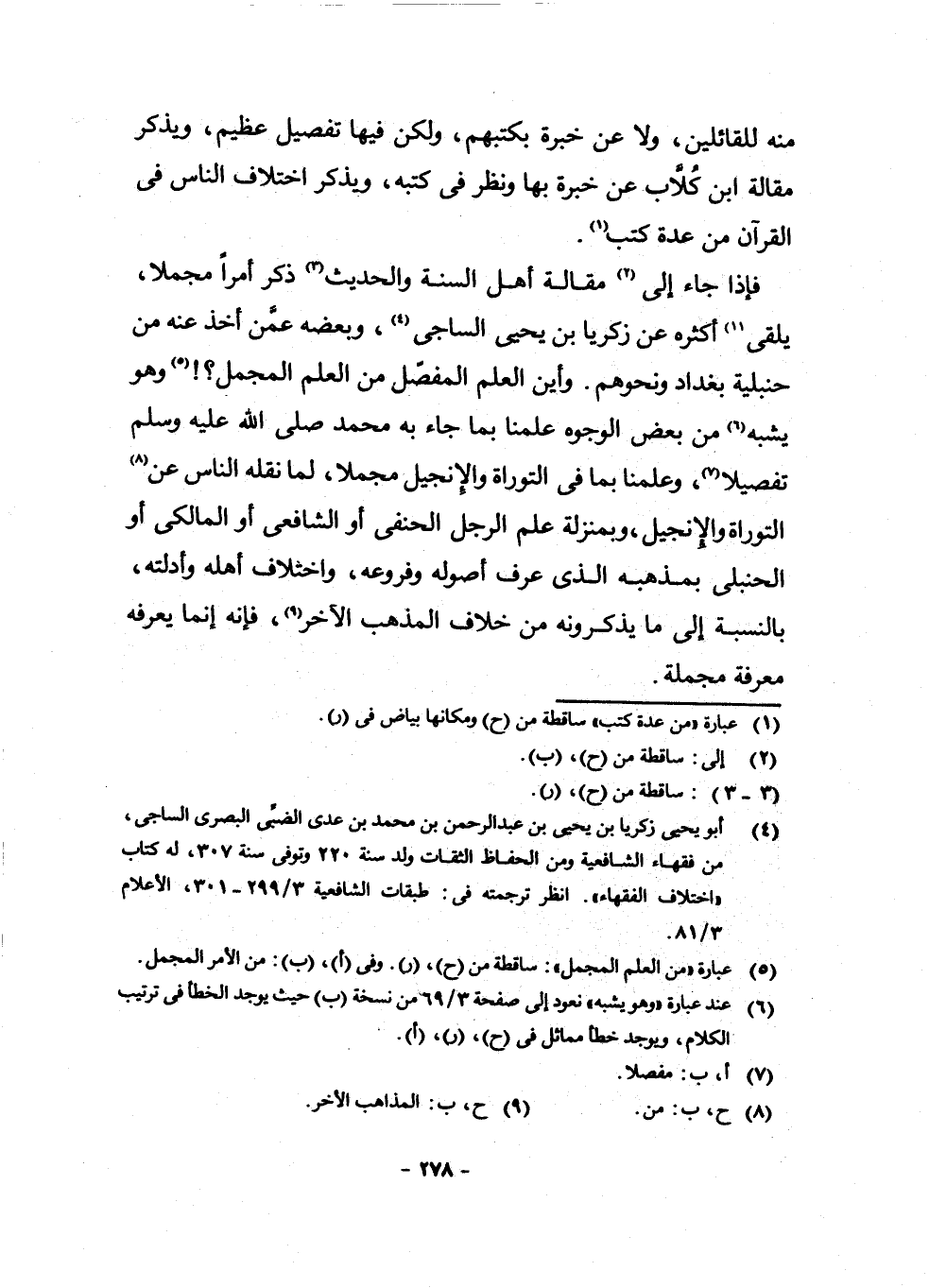فَإِذَا جَاءَ إِلَى (¬2) مَقَالَةِ أَهْلِ السُّنَّةِ وَالْحَدِيثِ ذَكَرَ أَمْرًا مُجْمَلًا، يَلْقَى (¬3) أَكْثَرَهُ عَنْ زَكَرِيَّا بْنِ يَحْيَى السَّاجِيِّ (¬4) ، وَبَعْضَهُ عَمَّنْ أَخَذَ عَنْهُ مِنْ حَنْبَلِيَّةِ بَغْدَادَ وَنَحْوِهِمْ. وَأَيْنَ الْعِلْمُ الْمُفَصَّلُ مِنَ الْعِلْمِ الْمُجْمَلِ؟ (¬5) وَهُوَ يُشْبِهُ (¬6) مِنْ بَعْضِ الْوُجُوهِ، عَلِمْنَا بِمَا جَاءَ بِهِ مُحَمَّدٌ - صَلَّى اللَّهُ عَلَيْهِ وَسَلَّمَ - تَفْصِيلًا (¬7) ، وَعَلِمْنَا بِمَا فِي التَّوْرَاةِ وَالْإِنْجِيلِ مُجْمَلًا، لِمَا نَقَلَهُ النَّاسُ عَنْ (¬8) التَّوْرَاةِ وَالْإِنْجِيلِ، وَبِمَنْزِلَةِ عِلْمِ الرَّجُلِ الْحَنَفِيِّ أَوِ الشَّافِعِيِّ أَوِ الْمَالِكِيِّ أَوِ الْحَنْبَلِيِّ بِمَذْهَبِهِ الَّذِي عَرَفَ أُصُولَهُ وَفُرُوعَهُ، وَاخْتِلَافَ أَهْلِهِ وَأَدِلَّتِهِ، بِالنِّسْبَةِ إِلَى مَا يَذْكُرُونَهُ مِنْ خِلَافِ الْمَذْهَبِ الْآخَرِ (¬9) ، فَإِنَّهُ إِنَّمَا يَعْرِفُهُ مَعْرِفَةً مُجْمَلَةً.