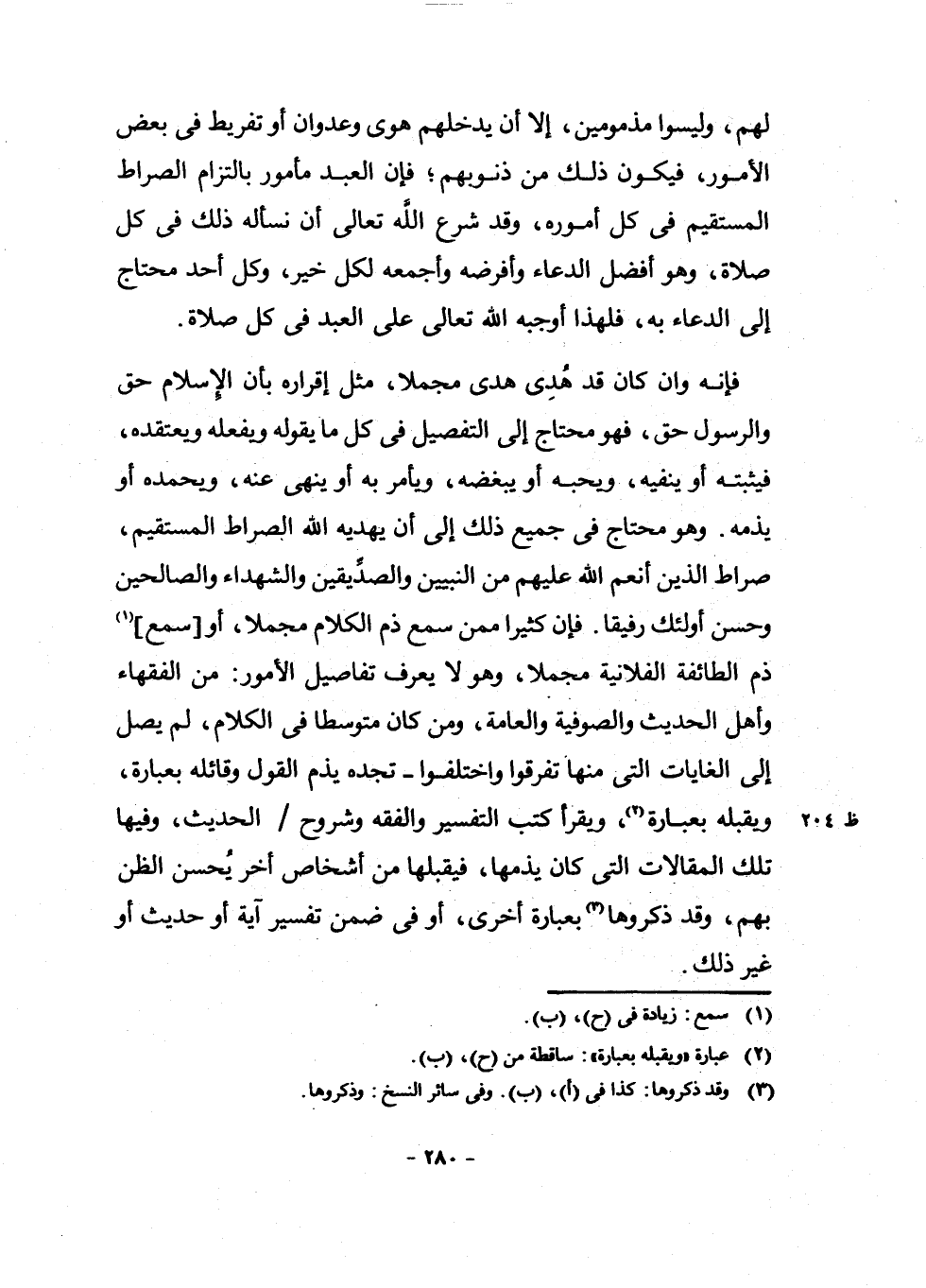 فَإِنَّهُ وَإِنْ كَانَ قَدْ هُدِيَ هَدًى مُجْمَلًا، مِثْلُ إِقْرَارِهِ بِأَنَّ الْإِسْلَامَ حَقٌّ وَالرَّسُولَ حَقٌّ، فَهُوَ مُحْتَاجٌ إِلَى التَّفْصِيلِ فِي كُلِّ مَا يَقُولُهُ وَيَفْعَلُهُ وَيَعْتَقِدُهُ، فَيُثْبِتُهُ أَوْ يَنْفِيهِ، وَيُحِبُّهُ أَوْ يُبْغِضُهُ، وَيَأْمُرُ بِهِ أَوْ يَنْهَى عَنْهُ، وَيَحْمَدُهُ أَوْ يَذُمُّهُ. وَهُوَ مُحْتَاجٌ فِي جَمِيعِ ذَلِكَ إِلَى أَنْ يَهْدِيَهُ اللَّهُ الصِّرَاطَ الْمُسْتَقِيمَ، صِرَاطَ الَّذِينَ أَنْعَمَ اللَّهُ عَلَيْهِمْ مِنَ النَّبِيِّينَ وَالصِّدِّيقِينَ وَالشُّهَدَاءِ وَالصَّالِحِينَ وَحَسُنَ أُولَئِكَ رَفِيقًا. فَإِنَّ كَثِيرًا مِمَّنْ سَمِعَ ذَمَّ الْكَلَامِ مُجْمَلًا، أَوْ سَمِعَ (¬1) ذَمَّ الطَّائِفَةِ الْفُلَانِيَّةِ مُجْمَلًا، وَهُوَ لَا يَعْرِفُ تَفَاصِيلَ الْأُمُورِ: مِنَ الْفُقَهَاءِ وَأَهْلِ الْحَدِيثِ وَالصُّوفِيَّةِ وَالْعَامَّةِ، وَمَنْ كَانَ مُتَوَسِّطًا فِي الْكَلَامِ، لَمْ يَصِلْ إِلَى الْغَايَاتِ الَّتِي مِنْهَا تَفَرَّقُوا وَاخْتَلَفُوا تَجِدُهُ يَذُمُّ الْقَوْلَ وَقَائِلَهُ بِعِبَارَةٍ، وَيَقْبَلُهُ بِعِبَارَةٍ (¬2) ، وَيَقْرَأُ كُتُبَ التَّفْسِيرِ وَالْفِقْهِ وَشُرُوحَ الْحَدِيثِ، وَفِيهَا تِلْكَ الْمَقَالَاتُ الَّتِي كَانَ يَذُمُّهَا، فَيَقْبَلُهَا مِنْ أَشْخَاصٍ أُخَرَ يُحْسِنُ الظَّنَّ بِهِمْ، وَقَدْ ذَكَرُوهَا (¬3) بِعِبَارَةٍ أُخْرَى، أَوْ فِي ضِمْنِ تَفْسِيرِ آيَةٍ أَوْ حَدِيثٍ أَوْ غَيْرِ ذَلِكَ.
