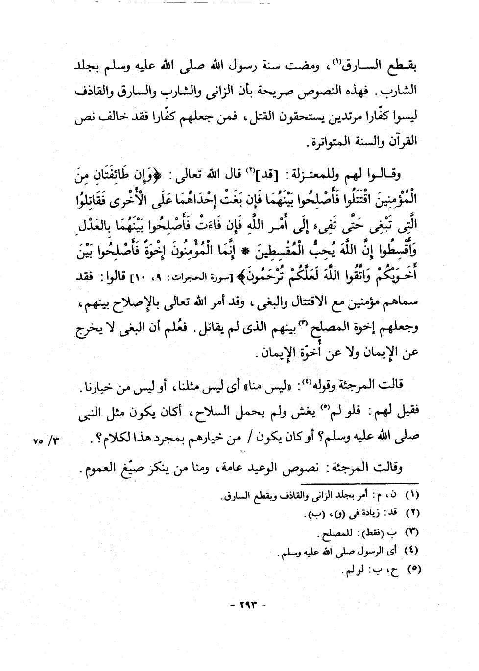 بِقَطْعِ السَّارِقِ (¬1) ، وَمَضَتْ سُنَّةُ رَسُولِ اللَّهِ - صَلَّى اللَّهُ عَلَيْهِ وَسَلَّمَ - بِجَلْدِ الشَّارِبِ. فَهَذِهِ النُّصُوصُ صَرِيحَةٌ بِأَنَّ الزَّانِيَ وَالشَّارِبَ وَالسَّارِقَ وَالْقَاذِفَ لَيْسُوا كُفَّارًا مُرْتَدِّينَ يَسْتَحِقُّونَ الْقَتْلَ، فَمَنْ جَعَلَهُمْ كُفَّارًا فَقَدْ خَالَفَ نَصَّ الْقُرْآنِ وَالسُّنَّةِ الْمُتَوَاتِرَةِ.