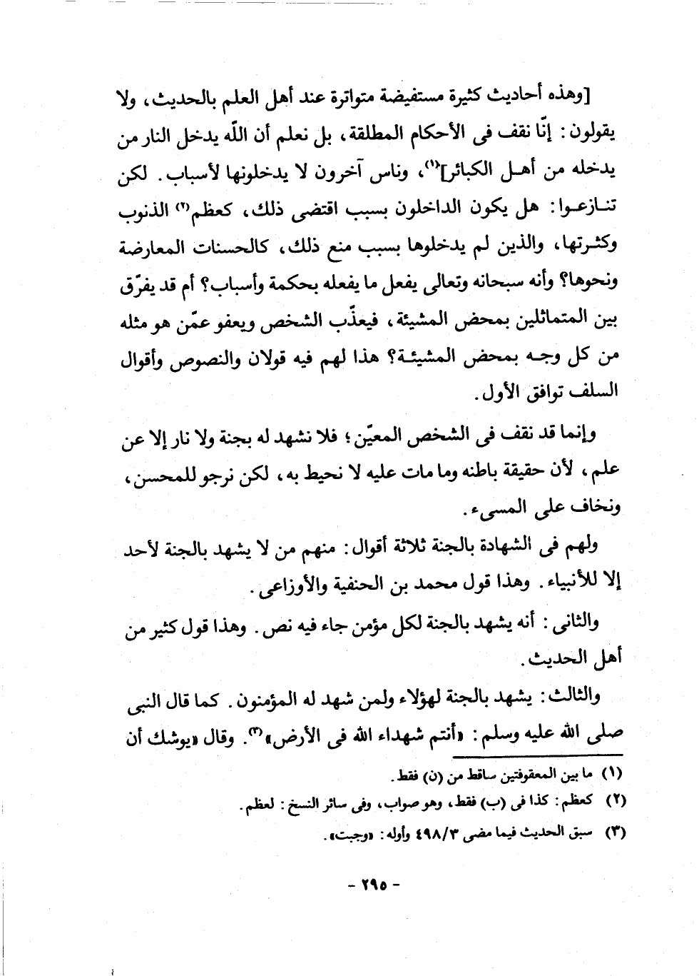 وَإِنَّمَا قَدْ نَقِفُ فِي الشَّخْصِ الْمُعَيَّنِ ; فَلَا نَشْهَدُ لَهُ بِجَنَّةٍ وَلَا نَارٍ إِلَّا عَنْ عِلْمٍ، لِأَنَّ حَقِيقَةَ بَاطِنِهِ وَمَا مَاتَ عَلَيْهِ لَا نُحِيطُ بِهِ، لَكِنْ نَرْجُو لِلْمُحْسِنِ وَنَخَافُ عَلَى الْمُسِيءِ.