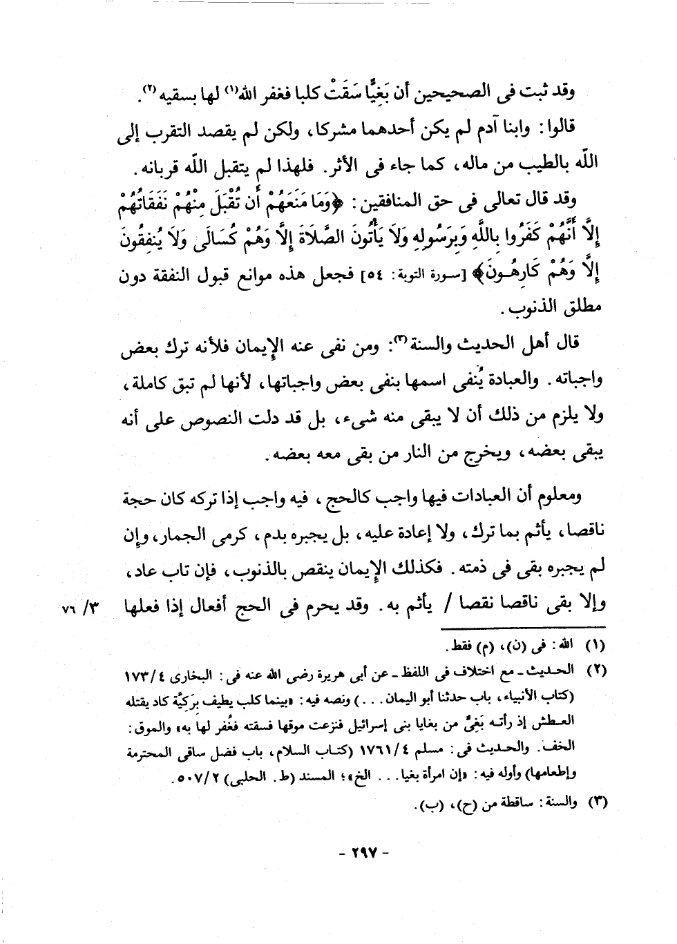 قَالَ أَهْلُ الْحَدِيثِ وَالسُّنَّةِ (¬3) : وَمَنْ نَفَى عَنْهُ الْإِيمَانَ فَلِأَنَّهُ تَرَكَ بَعْضَ وَاجِبَاتِهِ. وَالْعِبَادَةُ يُنْفَى اسْمُهَا بِنَفْيِ بَعْضِ وَاجِبَاتِهَا، لِأَنَّهَا لَمْ تَبْقَ كَامِلَةً، وَلَا يَلْزَمُ مِنْ ذَلِكَ أَنْ لَا يَبْقَى مِنْهُ شَيْءٌ، بَلْ قَدْ دَلَّتِ النُّصُوصُ عَلَى أَنَّهُ يَبْقَى بَعْضُهُ، وَيَخْرُجُ مِنَ النَّارِ مَنْ بَقِيَ مَعَهُ بَعْضُهُ.