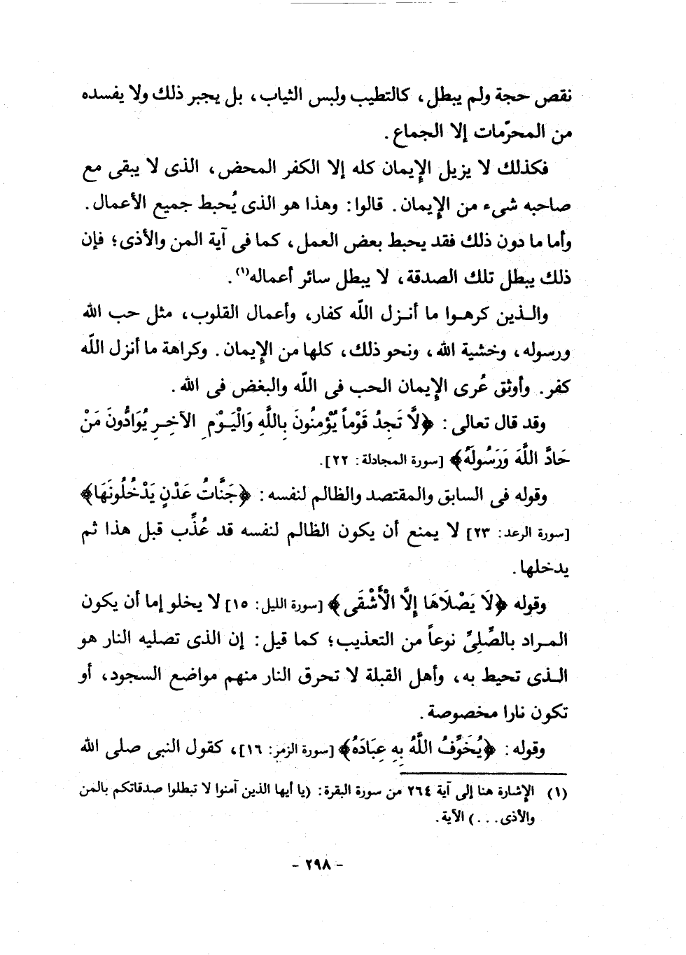فَكَذَلِكَ لَا يُزِيلُ الْإِيمَانَ كُلَّهُ إِلَّا الْكُفْرُ الْمَحْضُ، الَّذِي لَا يَبْقَى مَعَ صَاحِبِهِ شَيْءٌ مِنَ الْإِيمَانِ. قَالُوا: وَهَذَا هُوَ الَّذِي يُحْبِطُ جَمِيعَ الْأَعْمَالِ. وَأَمَّا مَا دُونُ ذَلِكَ فَقَدْ يُحْبِطُ بَعْضَ الْعَمَلِ، كَمَا فِي آيَةِ الْمَنِّ وَالْأَذَى ; فَإِنَّ ذَلِكَ يُبْطِلُ تِلْكَ الصَّدَقَةَ، لَا يُبْطِلُ سَائِرَ أَعْمَالِهِ (¬1) .